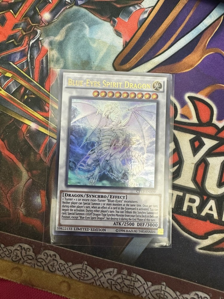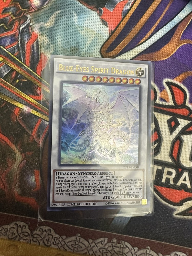 This limited edition Yu-Gi-Oh! TCG card features the Blue-Eyes Spirit Dragon, with 2500 attack and 3000 defense. It is an Ultra Rare card from the 2016 Mega-Tins set, with card number CT13-EN009. The card belongs to the Dragon / Synchro / Effect creature type, and is colored Light. This card is perfect for collectors and players of the Yu-Gi-Oh! TCG game. It is a valuable addition to any collection, and is sure to enhance any deck. Don't miss your chance to own this rare and powerful card.