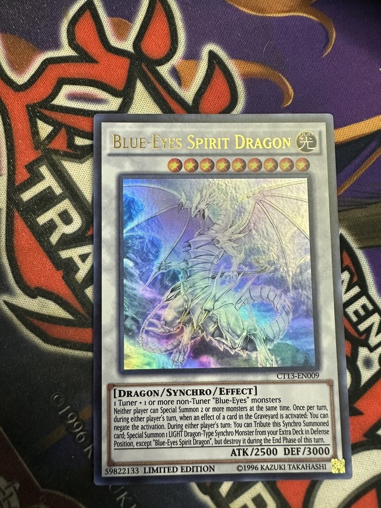 Offered for sale is the highly coveted Yu-Gi-Oh! TCG Blue-Eyes Spirit Dragon. This Ultra Rare, Limited Edition card is from the 2016 Mega-Tins set and has the card number CT13-EN009. This Dragon/Synchro/Effect creature has an Attack Power of 2500 and a Defense Toughness of 3000, making it a formidable addition to any deck. With its Light color and features, this Blue-Eyes Spirit Dragon is a must-have for collectors and players alike. Don't miss your chance to add this sought-after card to your collection.