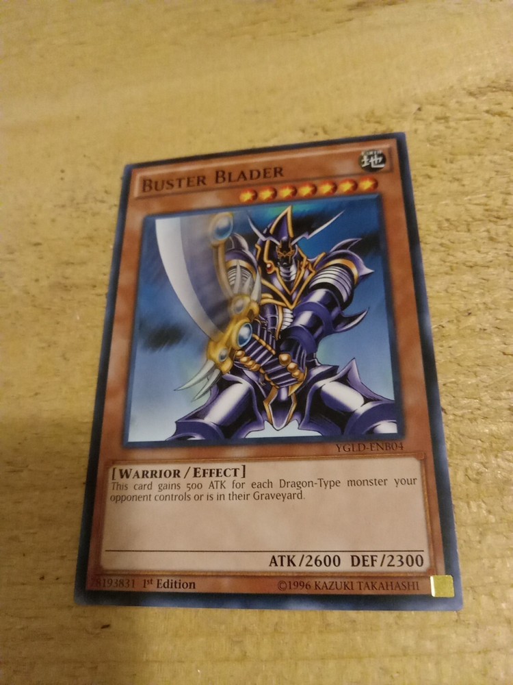 This Yu-Gi-Oh! TCG card features the powerful Buster Blader, a warrior type creature with 2300 defense and 2600 attack. It is a common/short print card from the King of Games: Yugi's Legendary Decks set, with an effect card type and YGLD-ENB04 card number. The card is in English language and manufactured by Konami. This 1st edition card is a must-have for any Yu-Gi-Oh! TCG collector or player, with its iconic design and rarity. The card's attributes include the Earth element and it is part of the Collectible Card Games category under Toys & Hobbies. Add this Buster Blader card to your collection today!