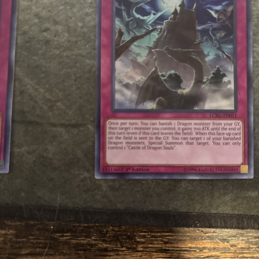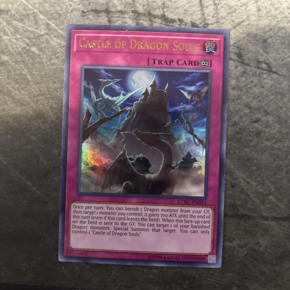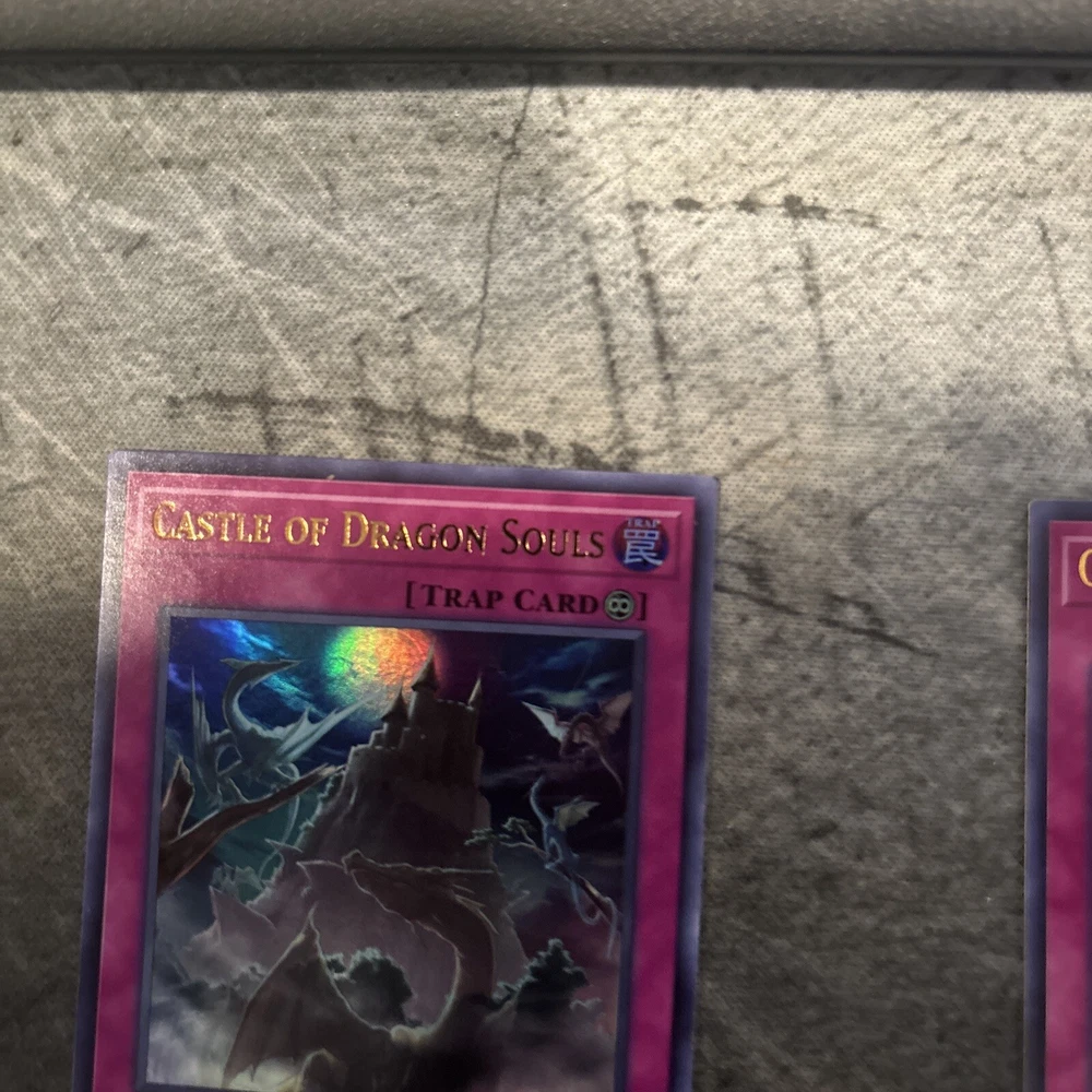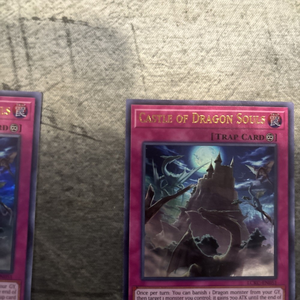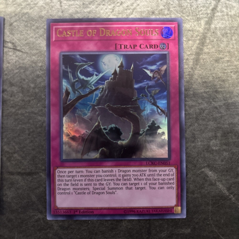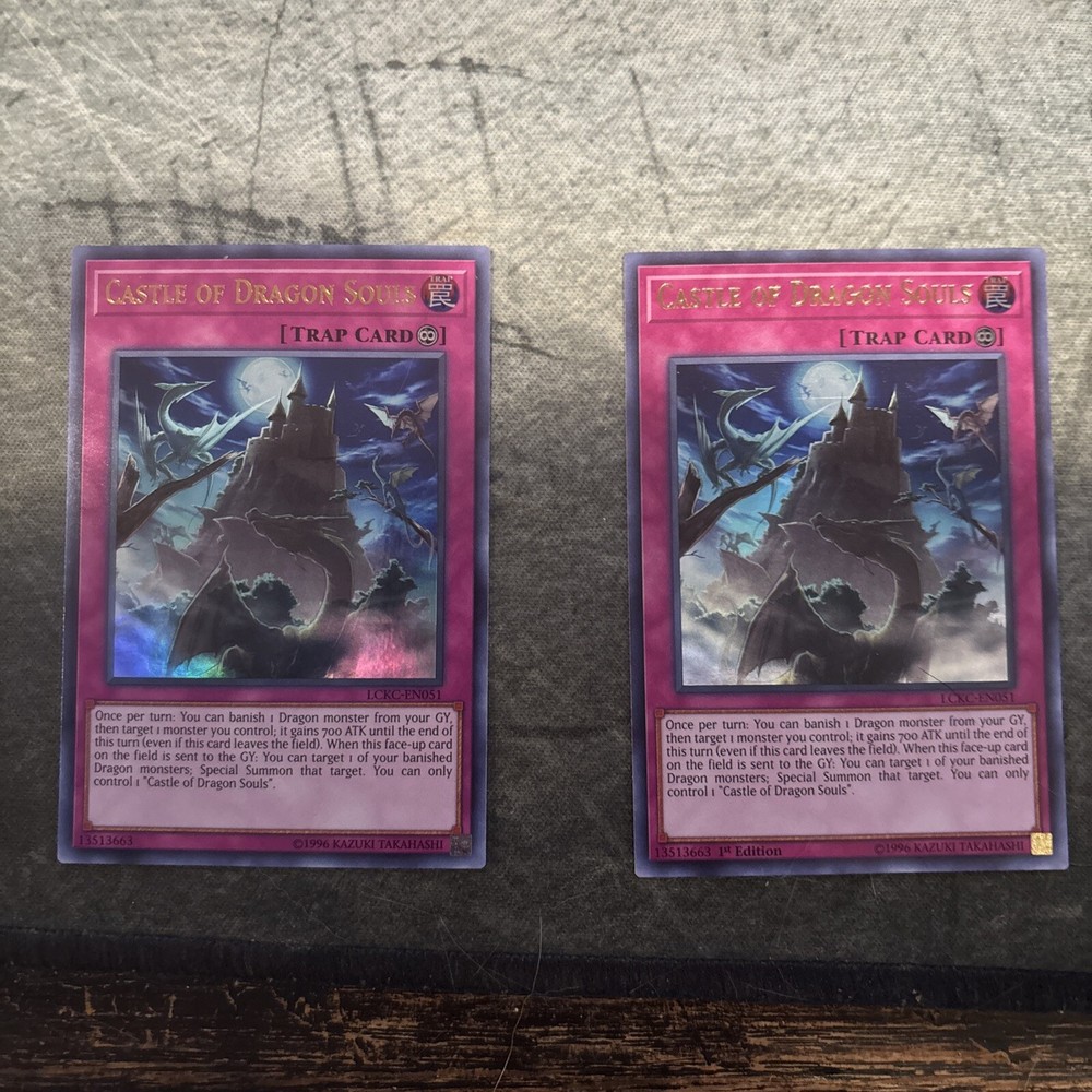 This listing is for one English 1st Edition and one non-1st edition Castle of Dragon Souls trap-continuous cards from the Yu-Gi-Oh! TCG by Konami. These cards are from the Legendary Collection Kaiba set, with the card number LCKC-EN051. The cards are in excellent condition and are a must-have for any Yu-Gi-Oh! collector. Add them to your CCG sets and complete your collection today.