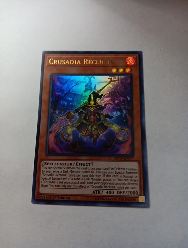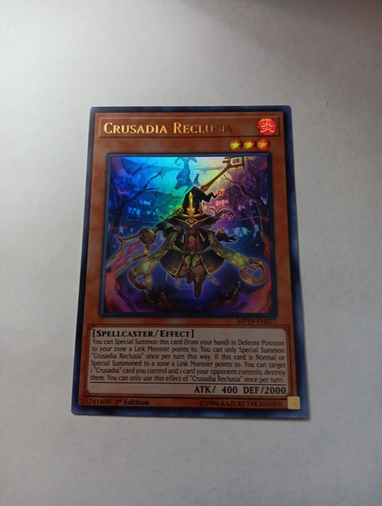 This Yu-Gi-Oh! TCG card is a 1st edition Ultra Rare Crusadia Reclusia from the 2019 Gold Sarcophagus Tin Mega Pack. The card is an Effect type with Card Number MP19-EN077 and features a Fire attribute with a Spellcaster creature/monster type. It has a defense/toughness of 2000 and an attack/power of 400. The card is perfect for collectors and players of the Yu-Gi-Oh! TCG game.