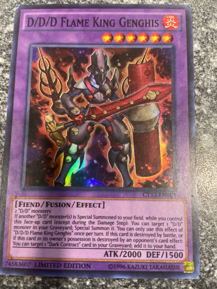 Experience the fiery power of the D/D/D Flame King Genghis card, a limited edition super rare from the 2016 Mega-Tins set of the Yu-Gi-Oh! TCG. This card features a stunning design and is perfect for collectors and players alike.With a defense of 1500 and an attack of 2000, this fiend/fusion/effect card is sure to cause a stir on the battlefield. The card number is CT13-EN005 and it comes in a fire attribute. Don't miss out on the chance to add this impressive card to your collection.