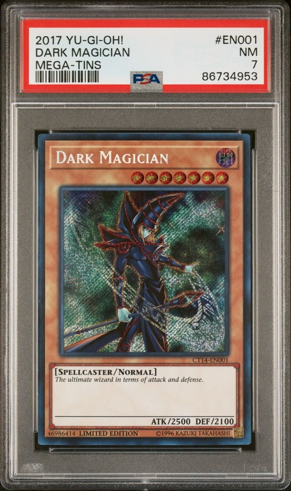 This limited edition Dark Magician card is a must-have for any Yu-Gi-Oh! TCG collector. With its secret rare rarity and PSA Grade 7 designation, this card is highly sought after. Its color is described as "darkness" and it comes from the 2017 Mega-Tins Promos set, with the card number CT14-EN001. As a normal type card, it has a variety of uses in gameplay and is a great addition to any deck. Whether you're a seasoned player or just starting out, this Dark Magician card is a valuable asset. Add it to your collection today and enjoy the power of the dark side!