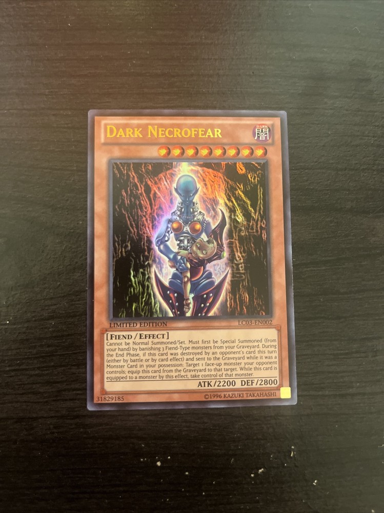 This limited edition Dark Necrofear card from Yu-Gi-Oh! TCG is a must-have for any collector. With a legendary rarity and fiend creature type, it's a powerful addition to any deck. The card is part of the Legendary Collection 3: Yugi's World and has the card number Lc03-En002. The Dark Necrofear card is an effect card with a dark color attribute. It's perfect for fans of the Yu-Gi-Oh! TCG who want to enhance their collection. Don't miss out on the opportunity to add this iconic card to your set.