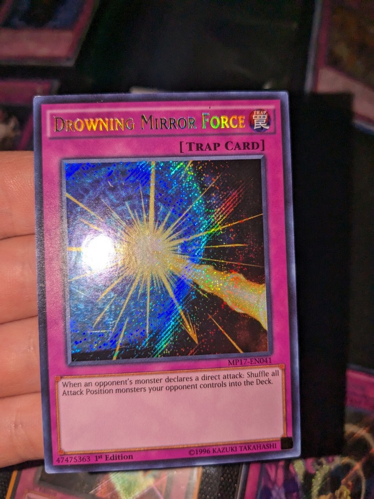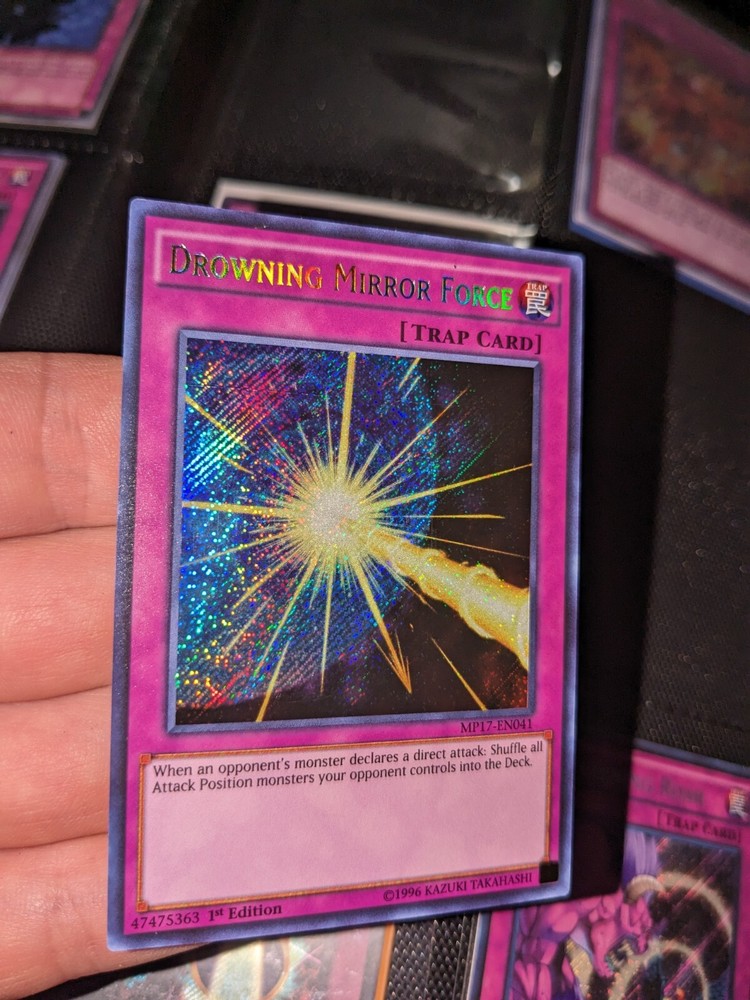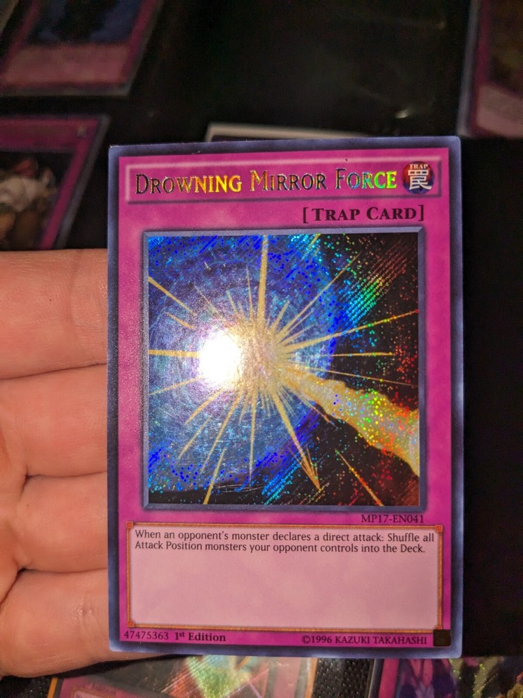 This Yu-Gi-Oh! TCG Drowning Mirror Force card is a must-have for any collector. With its Secret Rare Rarity and 1st Edition Features, it's a valuable addition to any collection. The card comes from the 2017 Mega-Tin Mega Pack Set, with the card number MP17-EN041. This card is a Trap-Normal type and is in excellent condition, with only light play. Its condition type is ungraded, making it a great purchase for any player or collector looking for a high-quality card. Don't miss out on the opportunity to add this card to your collection.