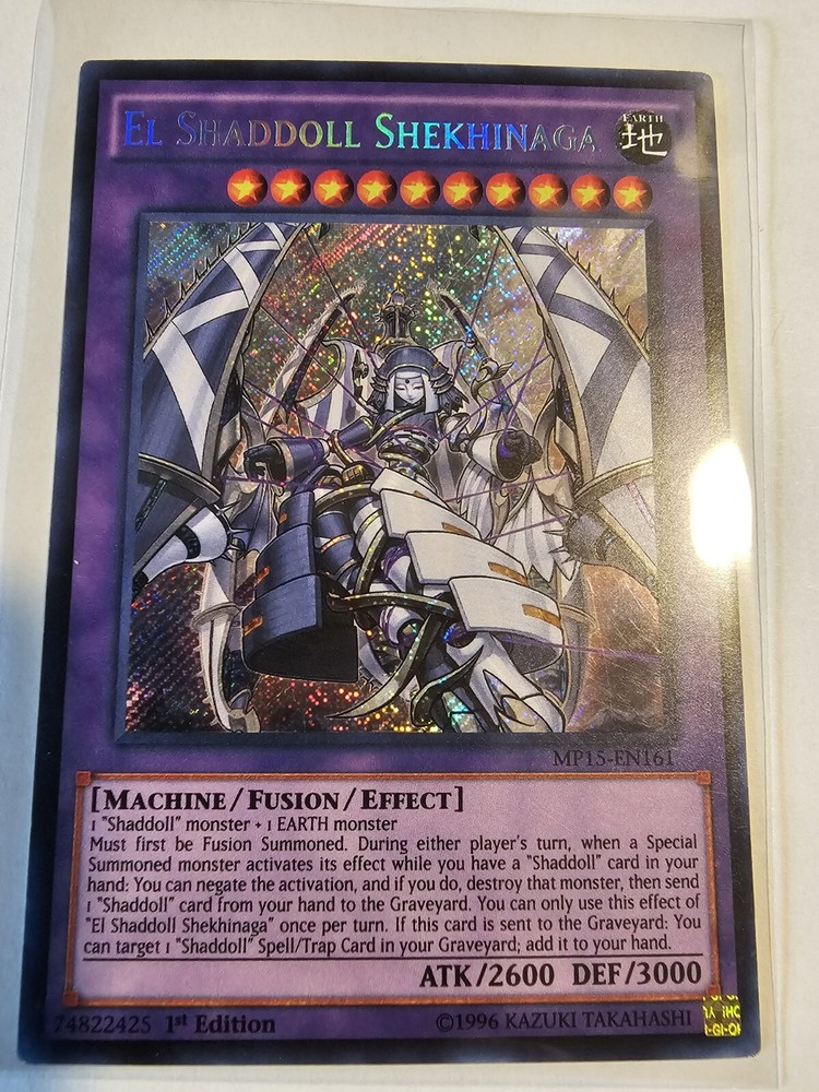 | Card Text | 1 "Shaddoll" monster + 1 EARTH monster Must first be Fusion Summoned. During either player's turn, when a Special Summoned monster activates its effect while you have a "Shaddoll" card in your hand: You can negate the activation, and if you do, destroy that monster, then send 1 "Shaddoll" card from your hand to the Graveyard. You can only use this effect of "El Shaddoll Shekhinaga" once per turn. If this card is sent to the Graveyard: You can target 1 "Shaddoll" Spell/Trap Card in your Graveyard; add it to your hand. |