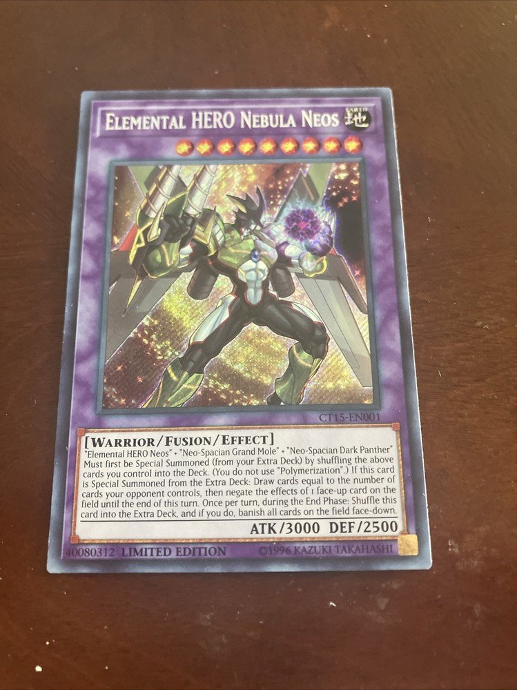 This limited edition Yu-Gi-Oh! TCG card, Elemental HERO Nebula Neos, is a powerful fusion monster with an Attack/Power of 3000 and a Defense/Toughness of 2500. It belongs to the 2018 Mega-Tins Promos set and has a Secret Rare rarity. The card is in near mint or better condition and is a great addition to any collector's deck. Featuring the Warrior type and the Earth attribute, this card is a valuable asset for any player looking to strengthen their deck. Its card type is an Effectfusion Monster and it has a card number of Ct15-En001. Don't miss out on the opportunity to own this highly sought-after card.