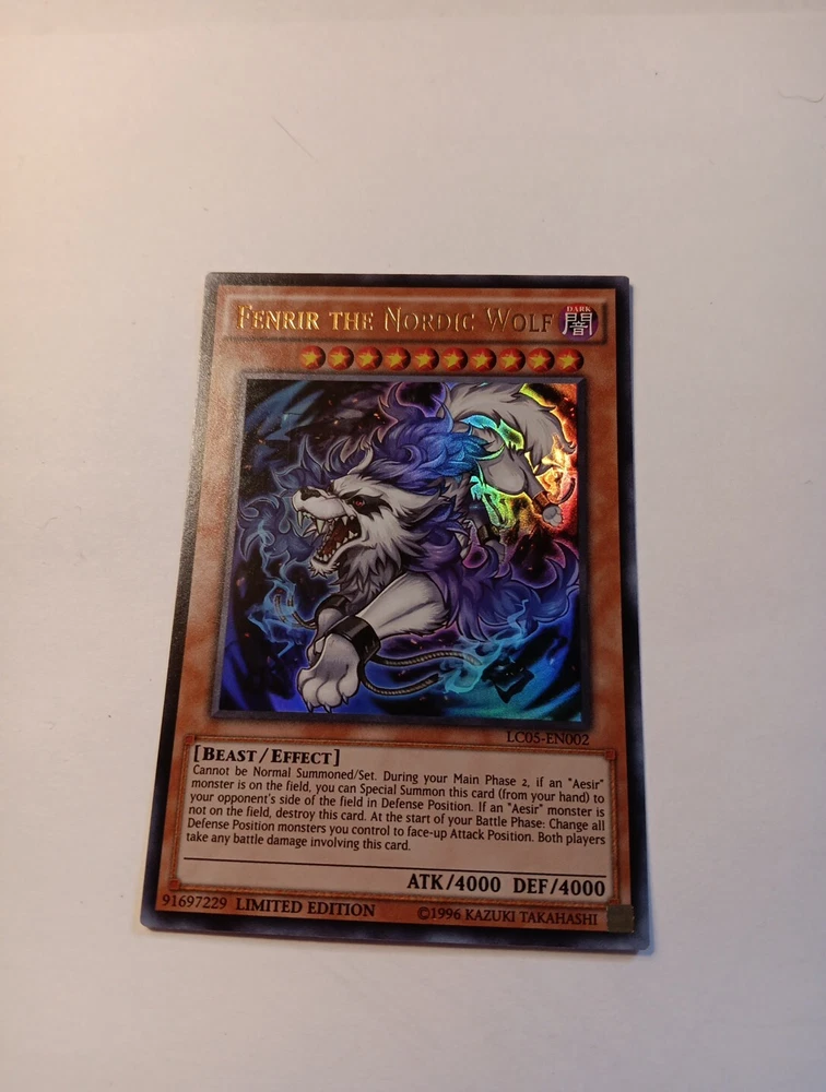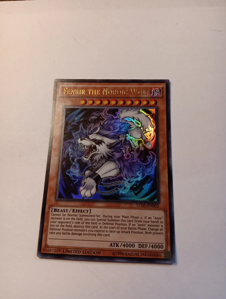 Introducing the Yu-Gi-Oh! TCG Fenrir the Nordic Wolf Legendary Collection 5D's LC05-EN002 card, a highly sought-after limited edition card. This card features a dark color attribute and ultra-rare rarity, with a beast creature/monster type and effect card type. With an attack power of 4000 and defense/toughness of 4000, this card is a valuable addition to any Yu-Gi-Oh! TCG collection. The card is from the Legendary Collection 5D's set and features Fenrir the Nordic Wolf card name. Don't miss your chance to add this card to your collection!