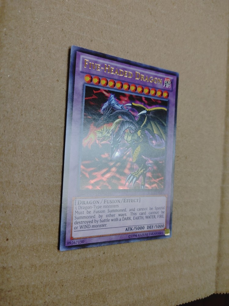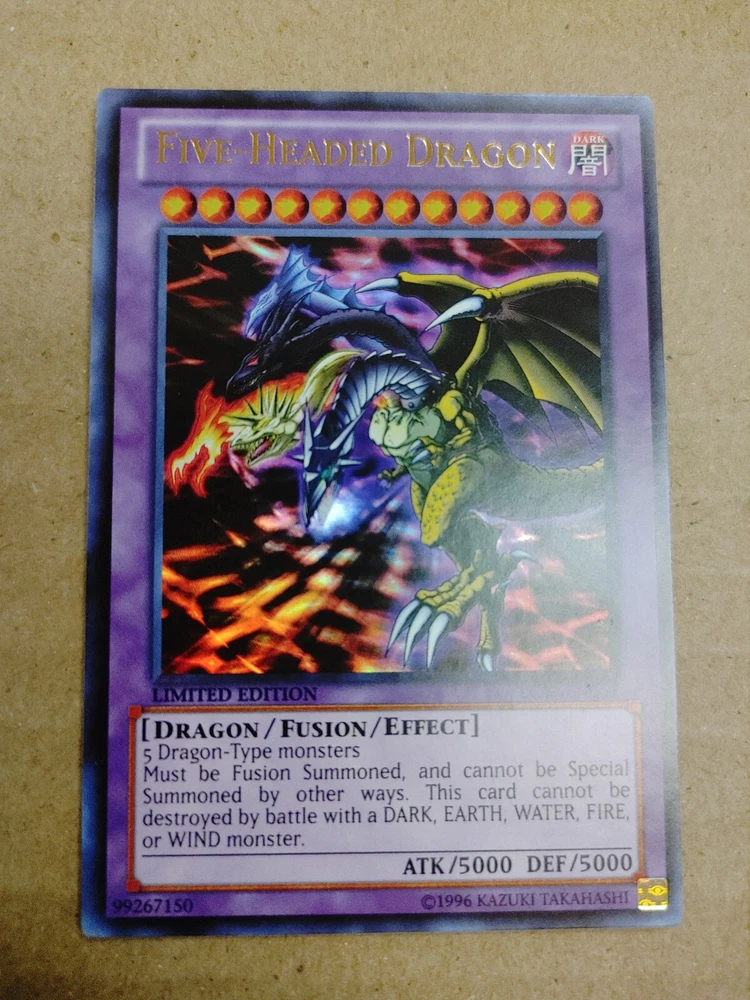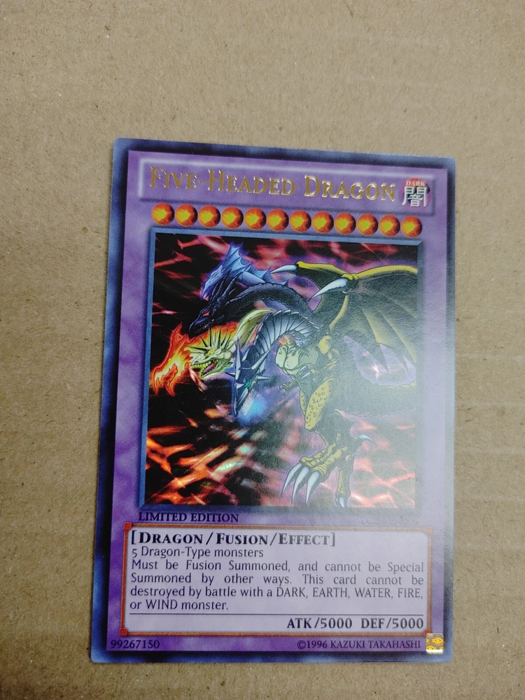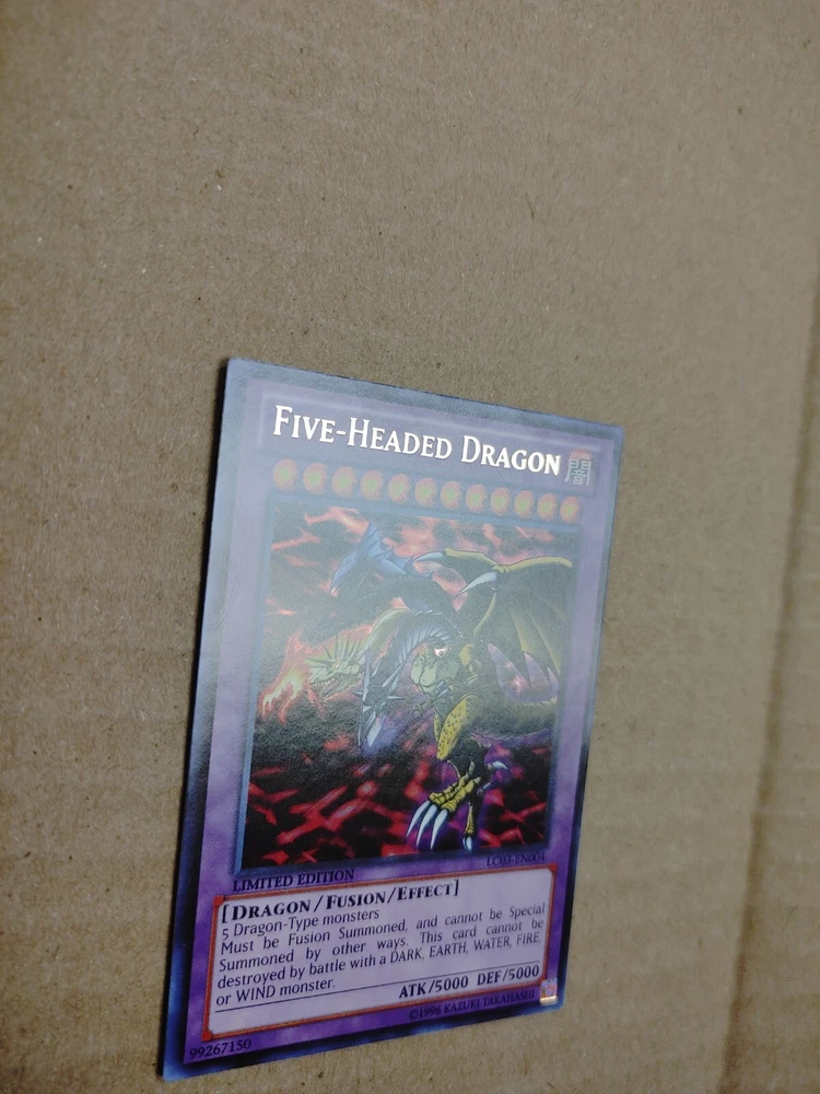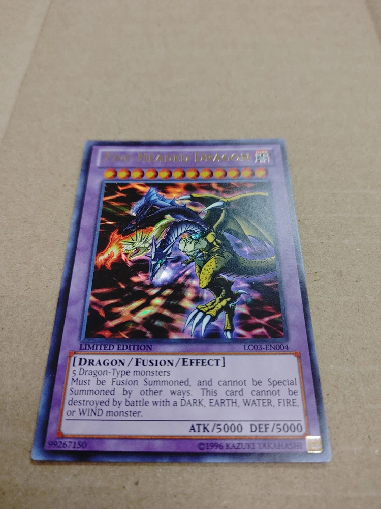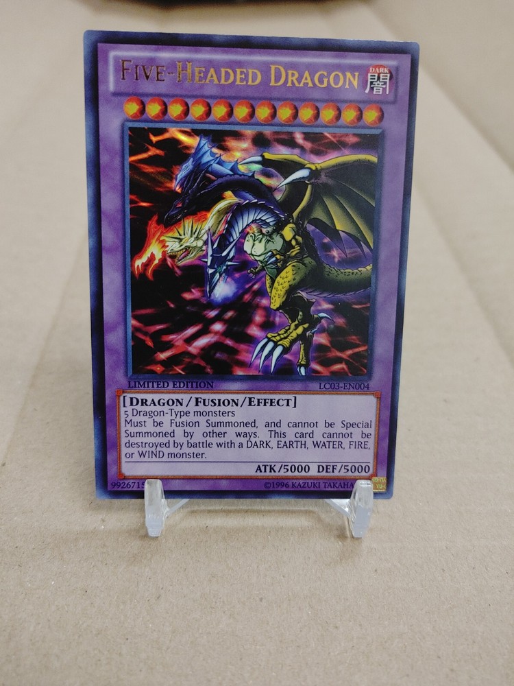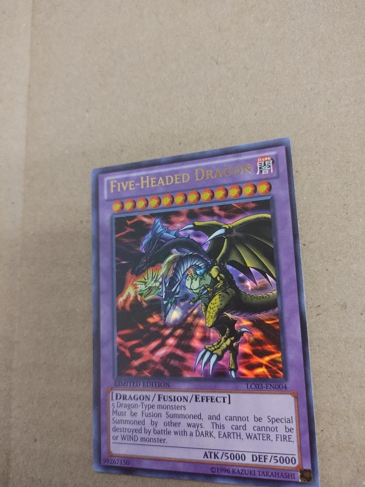 This limited edition Five-Headed Dragon card from Yu-Gi-Oh! TCG is a must-have for any collector or player. With its dark color and ultra-rare rarity, this fusion/ effect monster is sure to impress. The card is in near mint or better condition and is ungraded, making it even more valuable. The card belongs to the Legendary Collection 3: Yugi's World set and has the card number LC03-EN004. As a dragon type creature/ monster, it is a powerful addition to any deck. Don't miss out on the opportunity to add this amazing card to your collection.