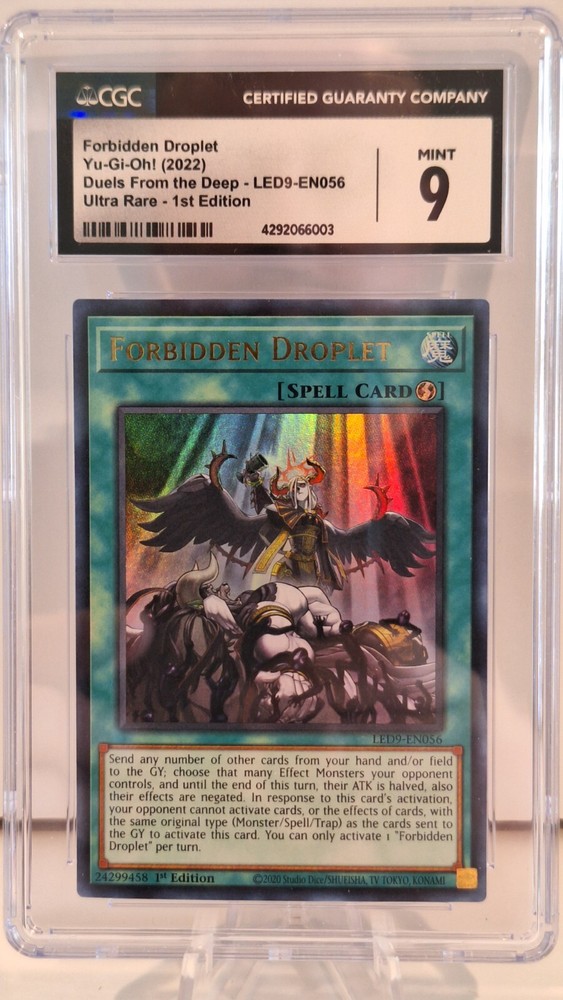 This Yu-Gi-Oh! TCG Forbidden Droplet from the Legendary Duelists: Duels From the Deep set is perfect for any card game collector. The card features a spell-quick play type with the card name Forbidden Droplet and card number Led9-En056. Additionally, it is a 1st edition card that has been professionally graded by the Certified Guaranty Company (CGC) with a grade of 9 and certification number 4292066003. The card's attributes include being a spell card with the color attribute of spell, making it a valuable addition to any player's deck. Get your hands on this card today to enhance your Yu-Gi-Oh! TCG collection.