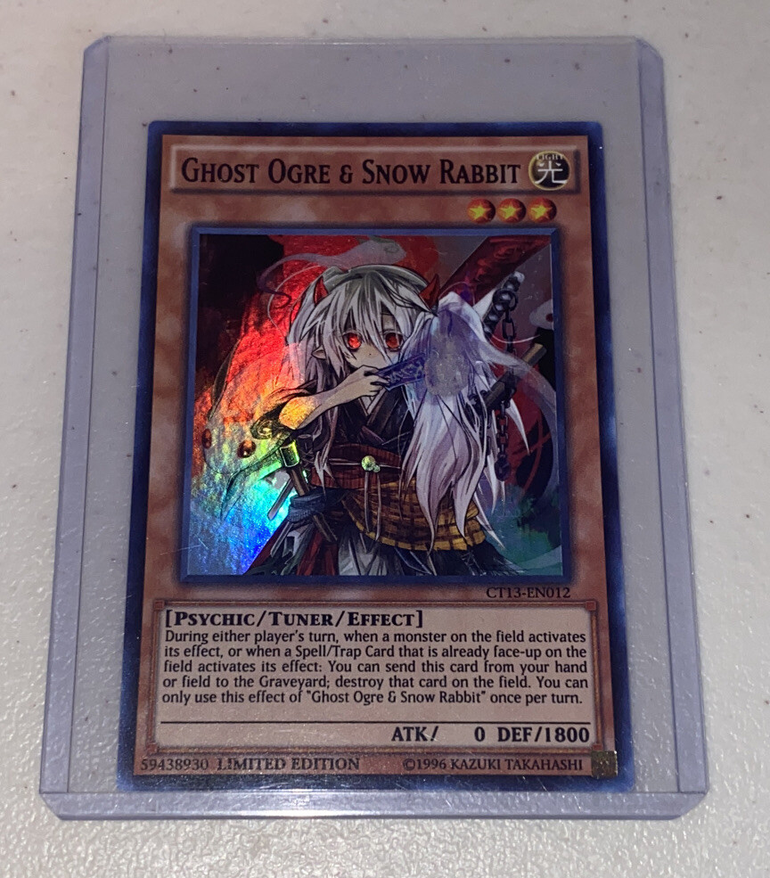 This is brand new never used! Was kept in a toploader! This limited edition 2016 Mega-Tins Ghost Ogre & Snow Rabbit card is a must-have for any Yu-Gi-Oh! TCG collector. The card features a Light attribute, 0 Attack/Power, and 1800 Defense/Toughness. Its Creature/Monster Type is Psychic/Tuner/Effect, and it belongs to the CT13-EN012 Card Number set. This card is perfect for players looking to strengthen their decks or collectors seeking to add a rare and valuable item to their collection. Don't miss your chance to own this highly sought-after Yu-Gi-Oh! TCG card!