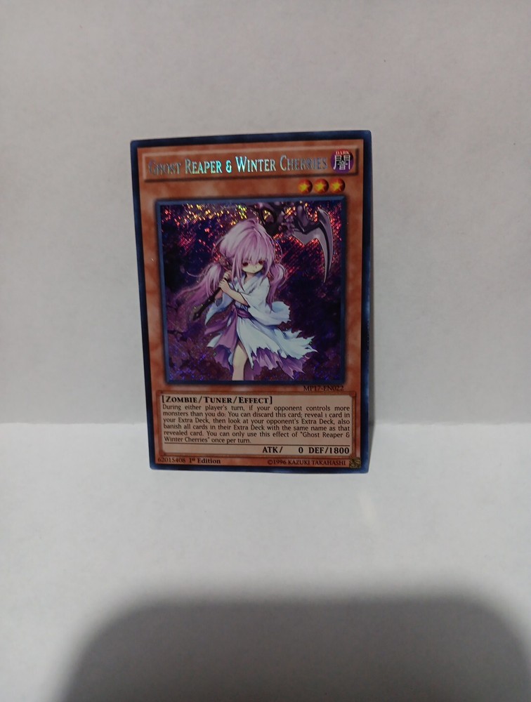 This Yu-Gi-Oh! TCG card is a Secret Rare Ghost Reaper & Winter Cherries from the 2017 Mega-Tin Mega Pack. It is an Effect Tuner Monster with the card number MP17-EN022 and features 1st edition printing. This card is in near mint or better condition and is ungraded. It is a highly sought-after card for collectors and players alike. This card has the potential to turn the tide of any game with its powerful effect. Don't miss your chance to add this rare card to your collection or deck.