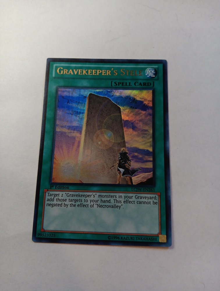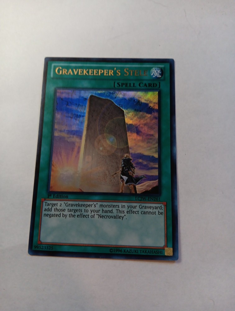 This Yu-Gi-Oh! TCG card is a 1st edition Ultra Rare Gravekeeper's Stele from the Legendary Collection 4 Mega-Pack. The card number is LCJW-EN261 and it is a Spell-Normal card type. It is perfect for collectors and players of the game. The card is in great shape and ready to be added to your collection. Don't miss out on this opportunity to own a piece of the Yu-Gi-Oh! TCG history.