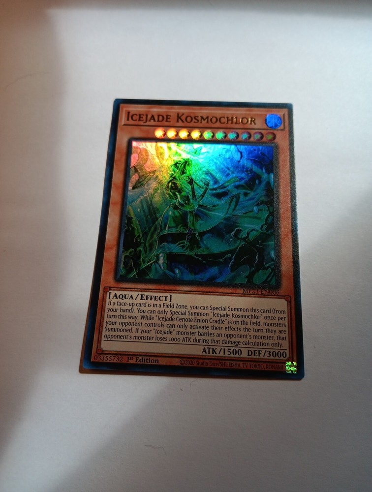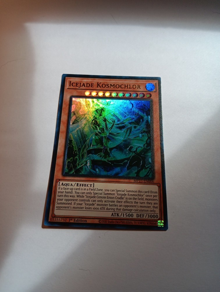 This Yu-Gi-Oh! TCG card features Icejade Kosmochlor, a Water-type Aqua creature with 3000 defense and 1500 attack. It is an Ultra Rare 1st Edition card from the 25th Anniversary Tin: Dueling Heroes Mega Pack set. The card number is MP23-EN006 and it is an Effect type card. With its stunning design and powerful features, this card is a must-have for any collector or player of the Yu-Gi-Oh! TCG game. It is perfect for those who love to battle with heroes and monsters, and will surely make a great addition to any collection. Get your hands on this amazing card now!