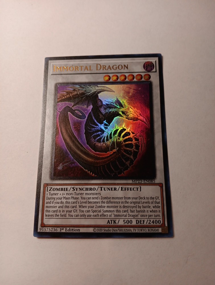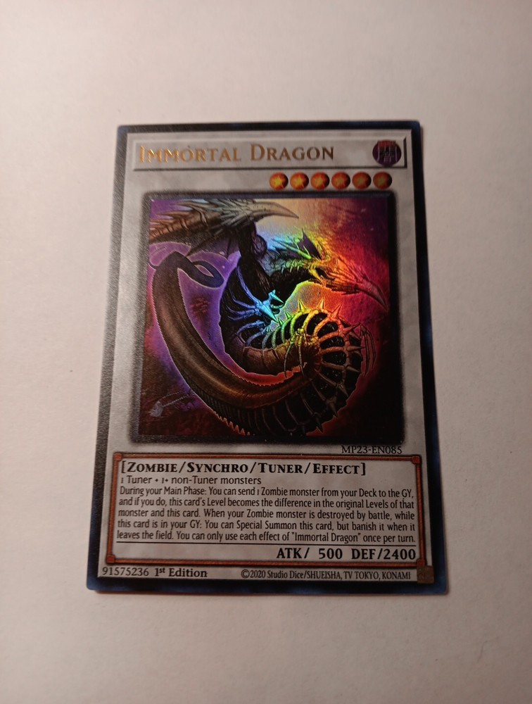 This Yu-Gi-Oh! TCG card is a must-have for any collector or player. With a dark attribute and 500 attack power, the Immortal Dragon is a powerful creature that can give you the edge you need in any game. This ultra-rare card is part of the 25th Anniversary Tin: Dueling Heroes Mega Pack set and has an effect card type with a card number of MP23-EN085. The card features a zombie/synchro/tuner creature type and a defense/toughness of 2400. It also has a unique feature of being a 1st edition card. This card is perfect for anyone who wants to add a valuable and powerful card to their collection.