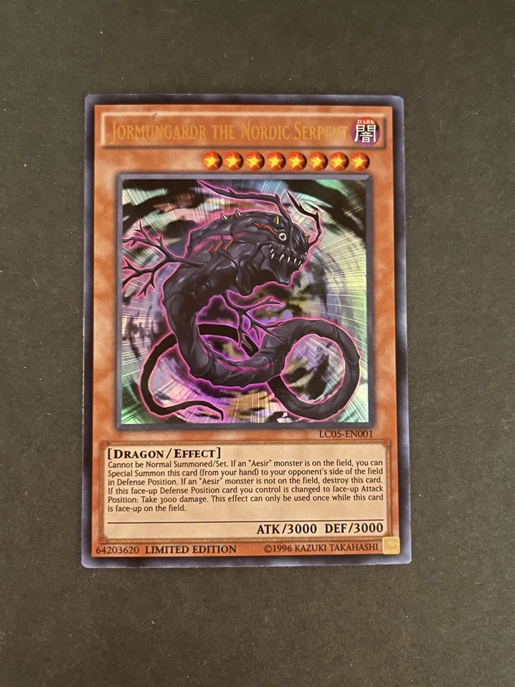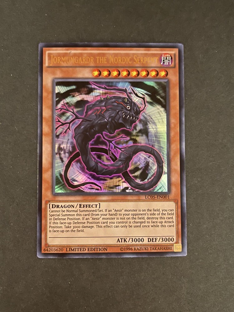 For all you Yu-Gi-Oh! TCG collectors out there, check out this limited edition Jormungardr the Nordic Serpent card from the Legendary Collection 5D's set. This rare card has a power of 3000 and a defense of 3000, making it a formidable addition to any deck. Its dragon creature type and effect card type also make it a unique and valuable card to have in your collection. Don't miss out on the chance to add this special card to your Yu-Gi-Oh! TCG collection. Get your hands on this Jormungardr the Nordic Serpent card before it's gone! Shipped in soft sleeve and top loader.