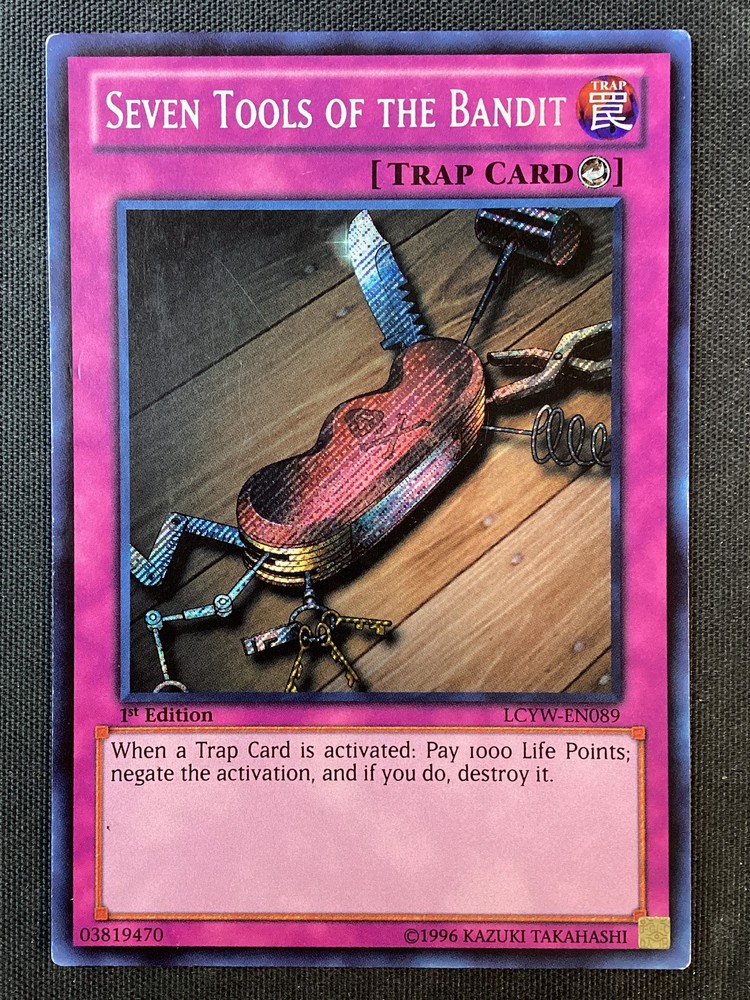 Thank you for looking! Please see scans for front and back! Check out this 2012 Yu-Gi-Oh #LCYW-EN089 Legendary Collection 3: Yugi's World Secret Rare Seven Tools of the Bandit We do NOT use stock photos. This is the actual card you receive! U.S. Shipping: Orders under $20 ship in PWE. We charge $1.50 per listing, then .10 cents each additional after the first. Shipping is capped at $5 total LOAD UP TCG = Pokemon, Magic the Gathering, Yu-Gi-Oh! We do not ship internationally.