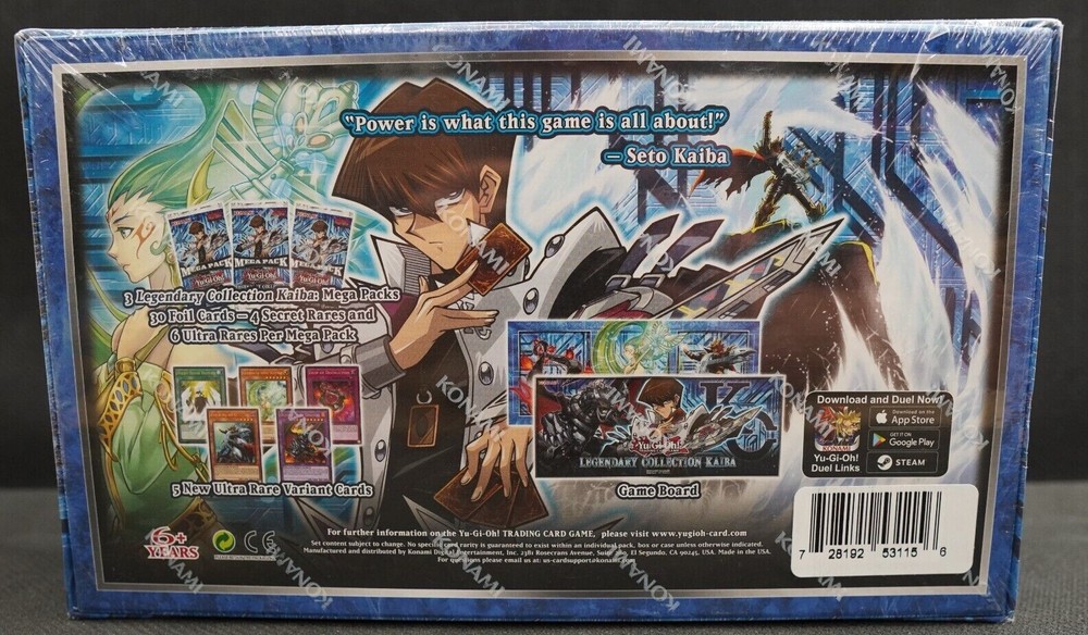 Brand New Factory Sealed Yu-Gi-Oh! TCG Legendary Collection Kaiba colletors set Legendary Collection Kaiba brings together many of Kaiba’s most famous cards unlike you’ve ever seen before! Kaiba is all about showing up his opponents with rare and powerful cards, so this Legendary Collection’s 110-card all-foil Mega Pack set includes many sought-after tournament level cards to bolster your Deck! You can find game-changing spells like Card of Demise as well as a slew of infectious traps like Crush Card Virus ; even popular monsters in tune with Ghost Ogre & Snow Rabbit , Droll & Lock Bird , and more! With four different artworks of Blue-Eyes White Dragon , you can hunt for the perfect set… and even tear up the fourth to make sure no one else can! Of course, there’s no way that Kaiba would settle for normal Mega Packs, so each of these Mega Packs contains 4 Secret Rares and 6 Ultra Rares for a total of 10 foil cards per pack (that’s 30 cards per box)! In addition, Legendary Collection Kaiba includes 5 brand-new cards inspired by famous entries in Kaiba’s arsenal. Lord of D. has a new incarnation that paves the way for mighty Dragons by finding powerful spells to herald their arrival! Alongside it, a radical rhapsody in opposite tune of The Flute of Summoning Dragon can help resurrect your fallen Dragons to the field! Even Ring of Destruction gets a new twist that’s a little less explosive, but will surely detonate any chance your opponent has in the long game. Topping it off in the Legendary Collection tradition is a hard-back, fold-up Game Board with a complete 1-player Duel Field on one side and an unbordered Kaiba art version on the other. Each Legendary Collection Kaiba box set contains: 3 Legendary Collection Kaiba Mega Packs 5 new Ultra Rare variant cards 1 Game Board
