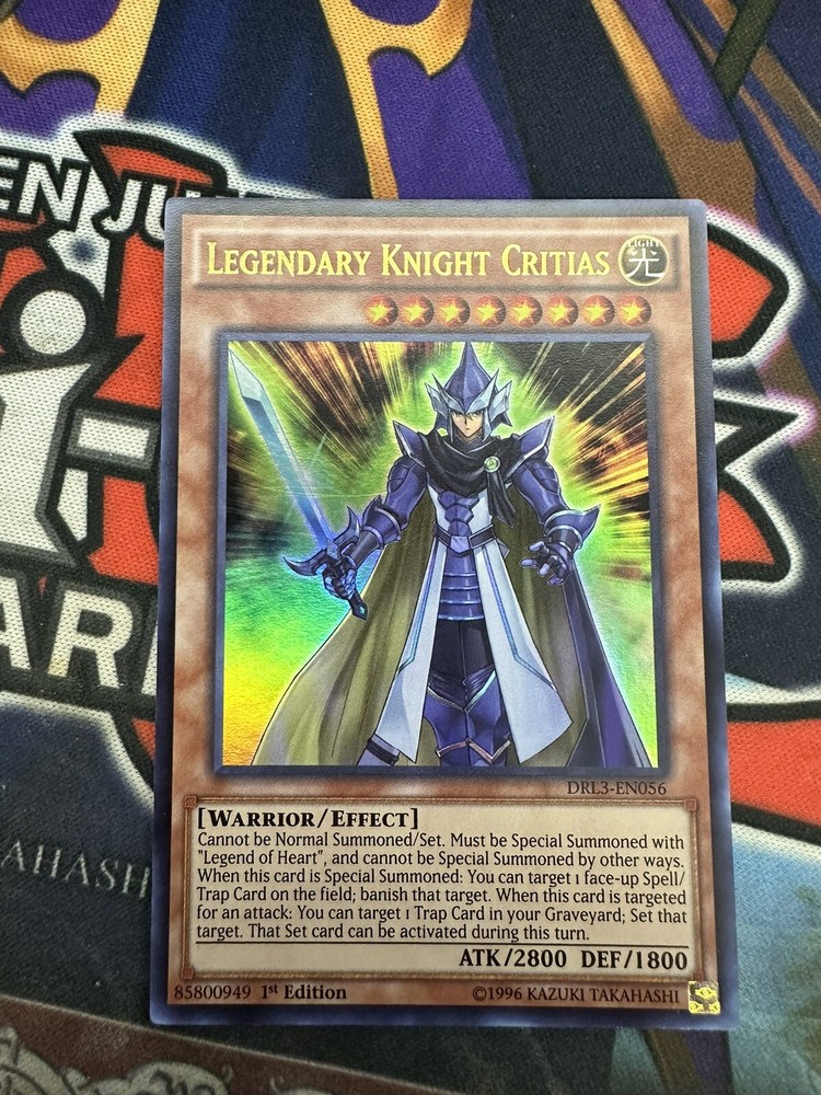 This Yu-Gi-Oh! TCG card is the Legendary Knight Critias from the Dragons of Legend: Unleashed set. It is an Ultra Rare card with 2800 Attack/Power and 1800 Defense/Toughness. The card is a Warrior/Effect monster with the attribute of Light and comes as a 1st Edition with the card number DRL3-EN056. This collectible card is perfect for any Yu-Gi-Oh! TCG fan and would make a great addition to any collection. It has unique features that make it stand out and can be used in-game to defeat opponents. Get your hands on this Legendary Knight Critias card and show off your Yu-Gi-Oh! TCG skills!