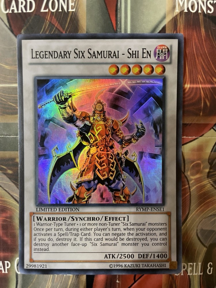 Enhance your Yu-Gi-Oh! TCG collection with the Legendary Six Samurai - Shi En card from the Ra Yellow Mega Pack. This Super Rare Synchro/Effect Monster card boasts an impressive 2500 attack power and 1400 defense toughness, making it a formidable addition to your deck. The card features a Dark attribute and is a Limited Edition card with the card number RYMP-ENSE1. Perfect for collectors and players alike, this Warrior-type creature will surely give your opponents a run for their money. Don't miss out on the opportunity to own this rare card.