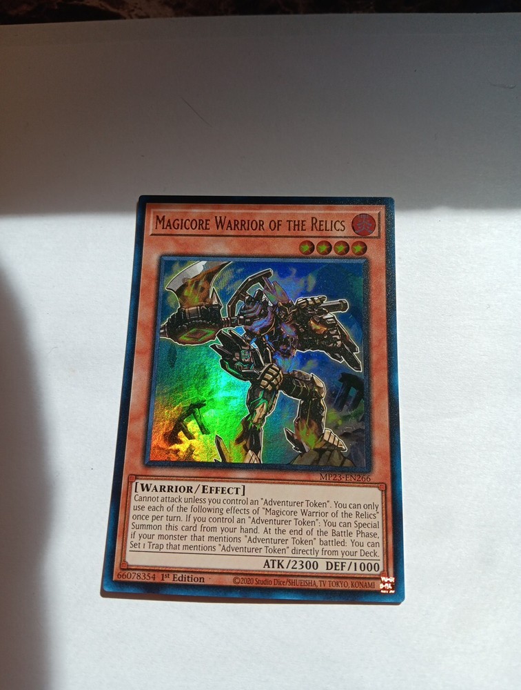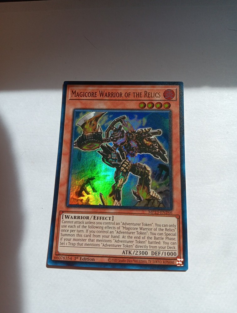 This Yu-Gi-Oh! TCG card is an Ultra Rare 1st Edition Magicore Warrior of the Relics from the 25th Anniversary Tin: Dueling Heroes Mega Pack. The card features a Fire Warrior creature type with an Attack/Power of 2300 and Defense/Toughness of 1000. It belongs to the Effect card type and has the Card Number MP23-EN266. The card is perfect for collectors and players of the Yu-Gi-Oh! TCG game.