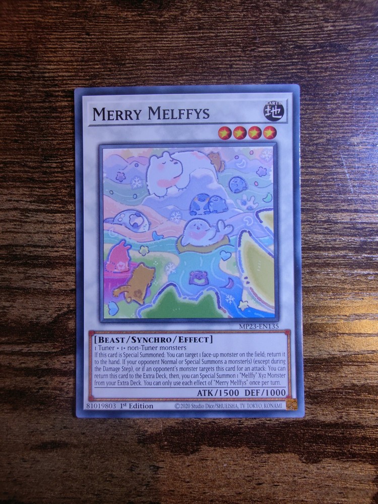 This Yu-Gi-Oh! TCG card features the powerful Merry Melffys, with 1500 attack and 1000 defence/toughness. It is a common card with a 1st edition feature, and belongs to the 25th Anniversary Tin: Dueling Heroes Mega Pack set. The card is an effect type, with the card number Mp23-En135. The card is perfect for collectors and players of the Yu-Gi-Oh! TCG game. Its Earth attribute and Beast/Synchro creature/monster type make it a formidable addition to any deck. The card is in great shape, with no visible signs of wear and tear. Get your hands on this amazing card today!