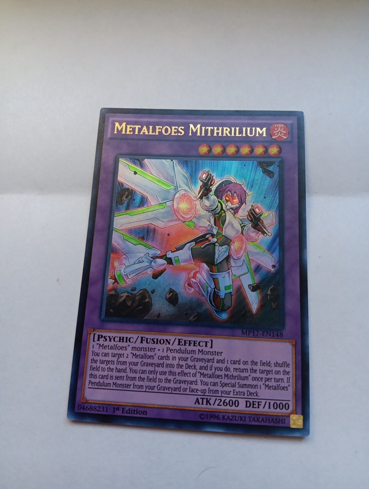 Experience the thrill of the Yu-Gi-Oh! TCG with this rare and sought-after Metalfoes Mithrilium card. This card is a must-have for any serious collector or player, with its Ultra Rare rarity and 1st Edition status. The card is part of the 2017 Mega-Tin Mega Pack set and features an Effectfusion Monster card type, making it a powerful addition to any deck. The card's card number is MP17-EN148 and it was manufactured in 2017. It is perfect for those who love the game and want to add a rare card to their collection. Don't miss out on the opportunity to own this amazing card.