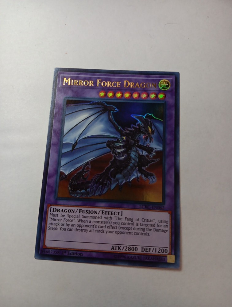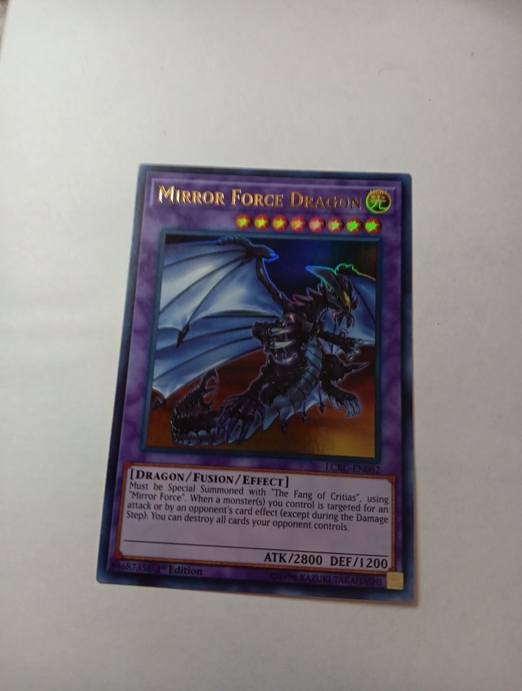 This Yu-Gi-Oh! TCG card is a must-have for any collector or player. The Mirror Force Dragon, with its 2800 attack and 1200 defense, is a powerful addition to any deck. This Ultra Rare card is part of the Legendary Collection Kaiba set and features a 1st Edition design. The card number is LCKC-EN062 and it is a CCG Individual Card. Whether you are a fan of the game or just collecting, this card is sure to impress. Its rarity and unique design make it a valuable addition to any collection. Don't miss your chance to own this powerful Mirror Force Dragon card.