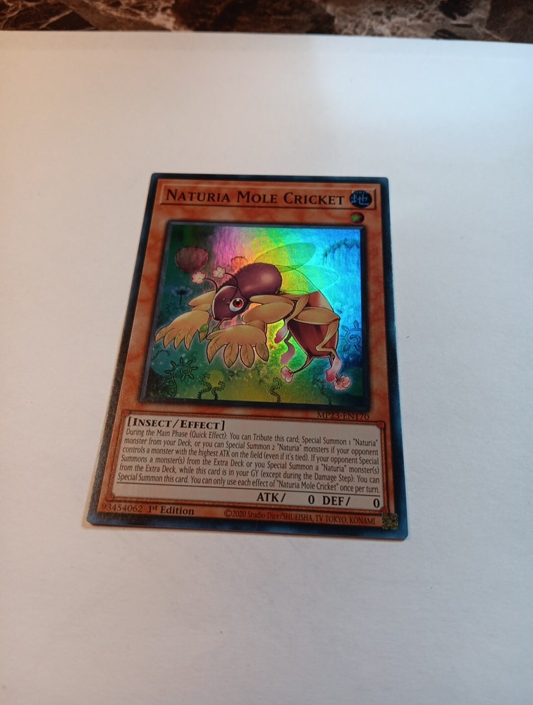 This Yu-Gi-Oh! TCG card features the Naturia Mole Cricket, a Super Rare insect creature with 0 attack and defense. It belongs to the 25th Anniversary Tin: Dueling Heroes Mega Pack set and has an Effect card type with a card number of MP23-EN170. The card is in 1st edition and is perfect for collectors and players of the game. The card's color is Earth and it is a great addition to any collection of collectible card games. The card is named after the creature, Naturia Mole Cricket, and is perfect for those who love the game's theme. This card is a must-have for any Yu-Gi-Oh! TCG player or collector.