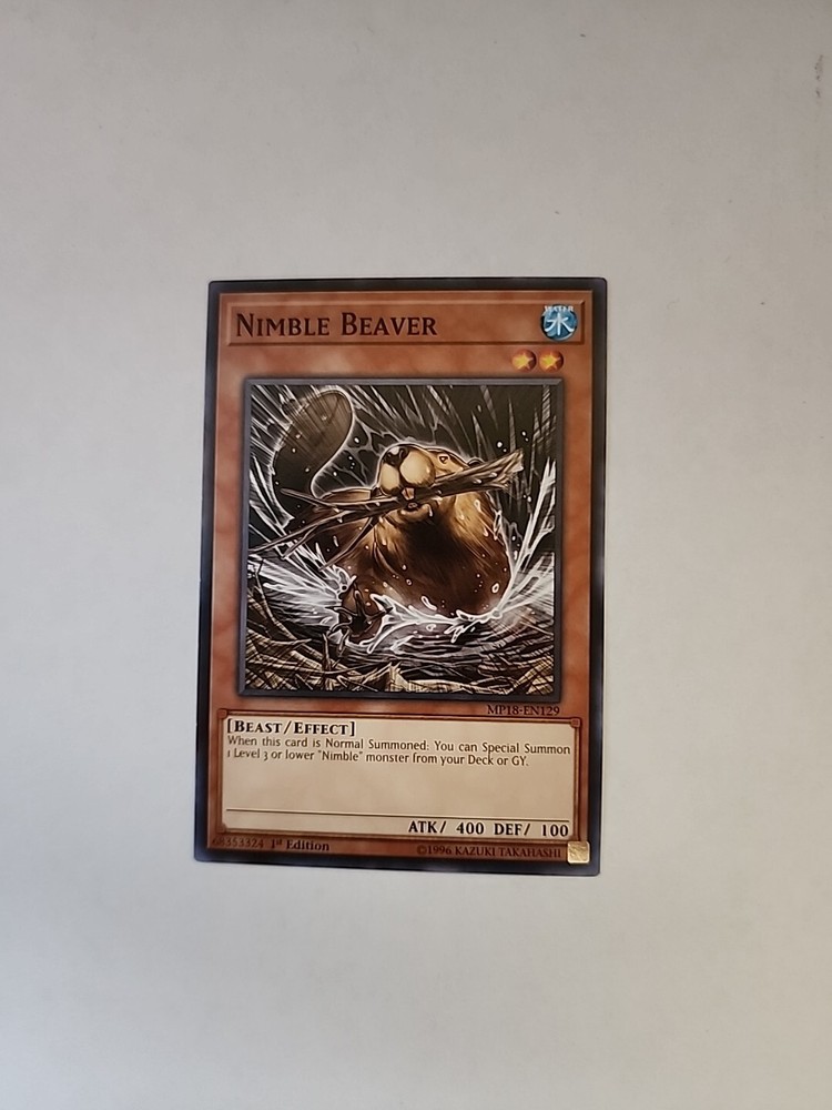 This Yu-Gi-Oh! TCG Nimble Beaver MP18-EN129 card is a great addition to your collection! The Water attribute and Beast type make it a valuable asset in battles. Measuring in at Japanese size and printed on durable card stock material with a regular finish, this card features 1st Edition and Common rarity, with a card number of MP18-EN129. The card has an Attack/Power of 400 and a Defense/Toughness of 200, making it a force to be reckoned with. The card has not been autographed and is not considered vintage. It is part of the 2018 Mega Tin Mega Pack set, and manufactured by Konami in the United States. The card comes in English language and its card type is an Effect.