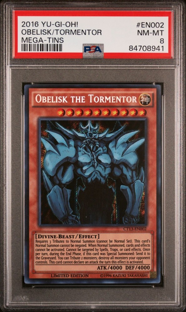 Up for sale is a rare and highly sought after Yu-Gi-Oh! TCG card, Obelisk The Tormentor. This Divine-Beast / Effect monster boasts an impressive 4000 Attack and Defense, making it a force to be reckoned with on the battlefield. Featured in the 2016 Mega-Tins set as a Limited Edition card with the card number Ct13-En002, this particular card has been graded PSA 8 for its exceptional condition. Perfect for any collector or player looking to add a powerful and unique card to their deck, Obelisk The Tormentor is a must-have for any Yu-Gi-Oh! enthusiast. Don't miss out on your chance to own this rare card and show off your skills in battle.