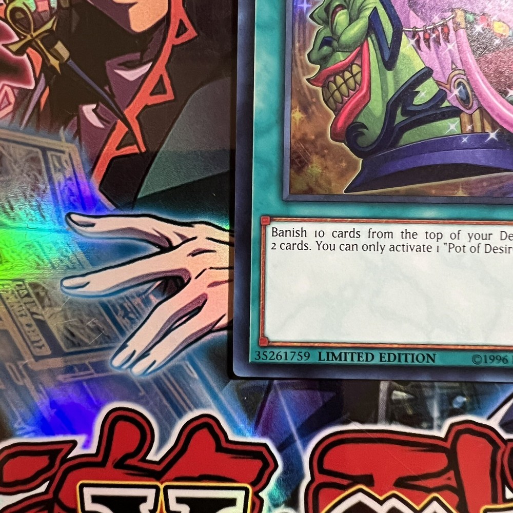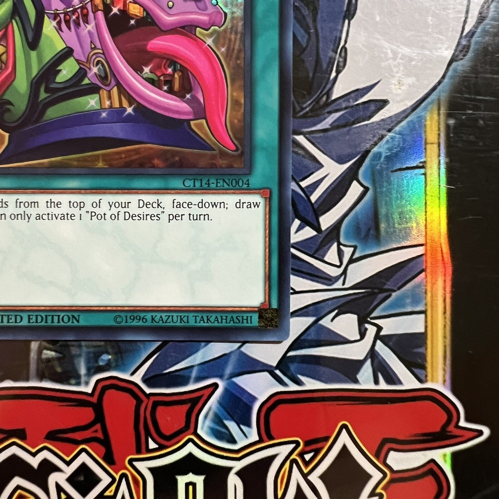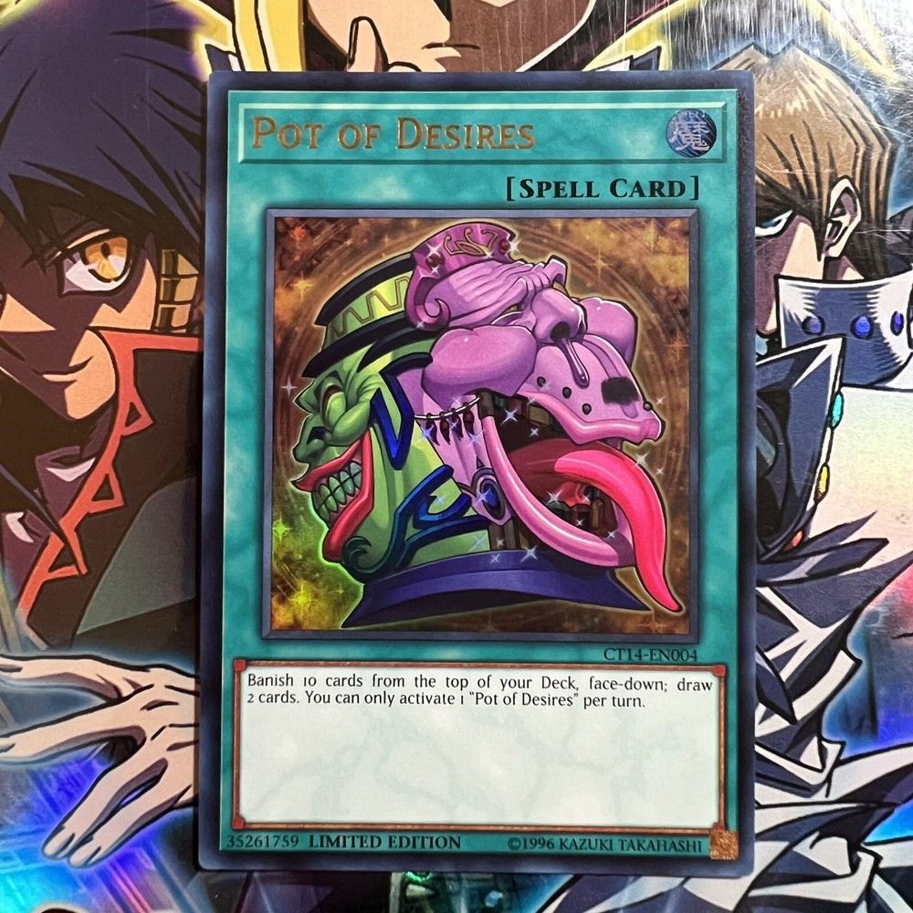*Open to bundles* Please see pictures to determine condition on your end. Card you see in pictures is the card you will receive. Package will be sent sleeved and in a top loader well protected! If you would like additional pictures, please don't hesitate to reach out! Thanks. Description: Experience the thrill of collecting with this limited edition Pot of Desires card from the 2017 Mega-Tins Promos set of the Yu-Gi-Oh! TCG. This Ultra Rare card is a must-have for any fan of the game, featuring the iconic CT14-EN004 card number and a Spell-Normal card type. With its stunning design and powerful abilities, this card is sure to impress any collector or player. Don't miss out on the chance to add this rare gem to your collection.