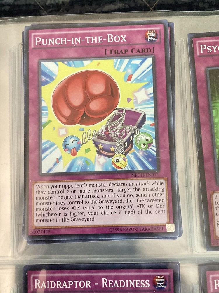 Yu-Gi-Oh! TCG Punch-in-the-Box is a common Trap card from the 2018 Mega Tin Pack. It is a 1st Edition card with the card number MP15-EN180. The card features a Punch-in-the-Box character and has a regular finish. The card is in English and manufactured by Konami. It is a standard-sized card suitable for players aged 6 and above. The card can be used in the Yu-Gi-Oh! Trading Card Game.