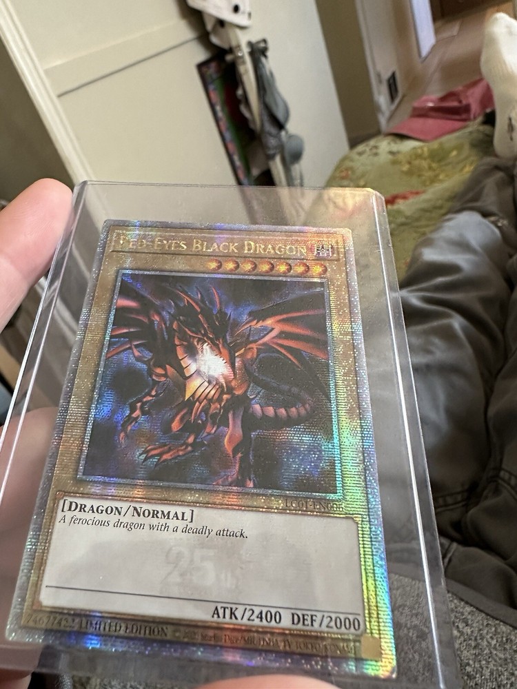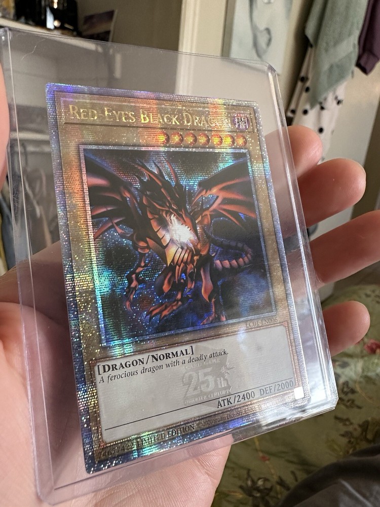 This limited edition Yu-Gi-Oh! TCG card features the iconic Red-Eyes B. Dragon, with a quarter century secret rare rarity and 2000 defense/toughness. The card is part of the Legendary Collection: 25th Anniversary Edition set, and has a card number of LC01-EN006. The card is a normal type and belongs to the Dragon creature/monster type, with an attack/power of 2400 and a unique feature of being a limited edition. It is perfect for collectors and fans of the Yu-Gi-Oh! TCG game. Incredible card, I am ONLY selling due to my gf insisting I make some money off my hobbies. Hope it goes to a good home.