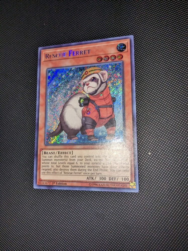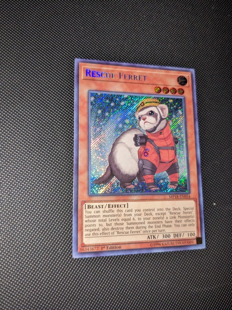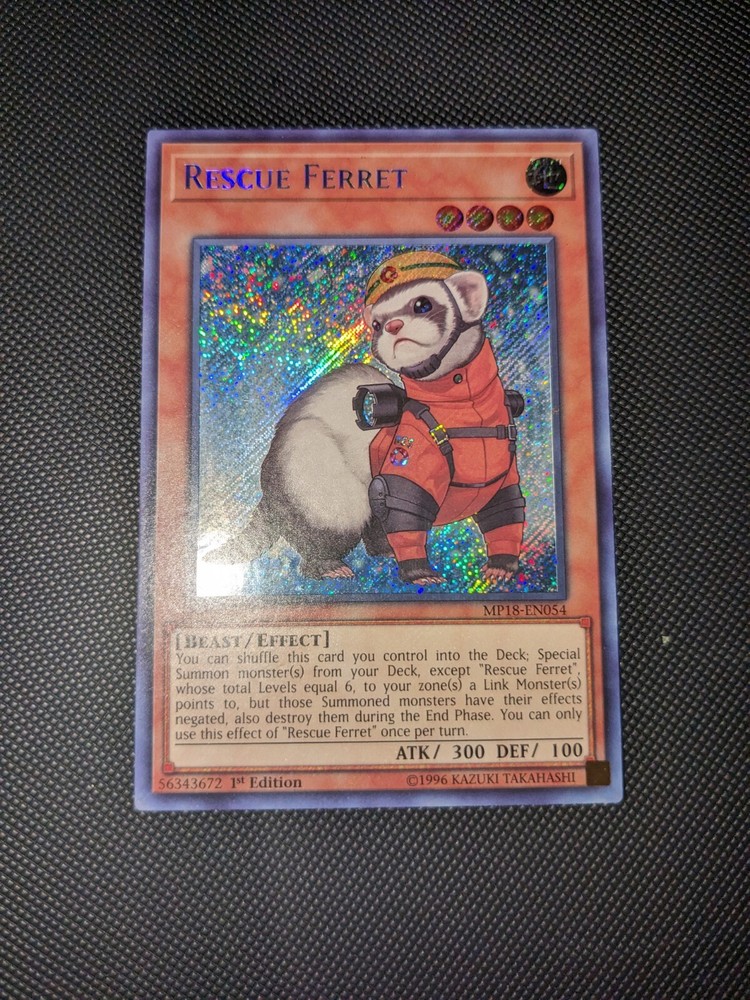 Up for sale is a rare and highly sought-after Yu-Gi-Oh! TCG card named Rescue Ferret. This card is part of the 2018 Mega-Tin Mega Pack and is a 1st Edition with the card number MP18-EN054. The card features a Beast creature/monster type, with Earth as its color. In addition, this Secret Rare card has an Attack/Power of 300 and a Defense/Toughness of 100. It is an Effect card that was manufactured in 2018. This card is a must-have for any serious Yu-Gi-Oh! TCG collector and will make a great addition to your collection. Don't miss out on the opportunity to own this rare and powerful card.