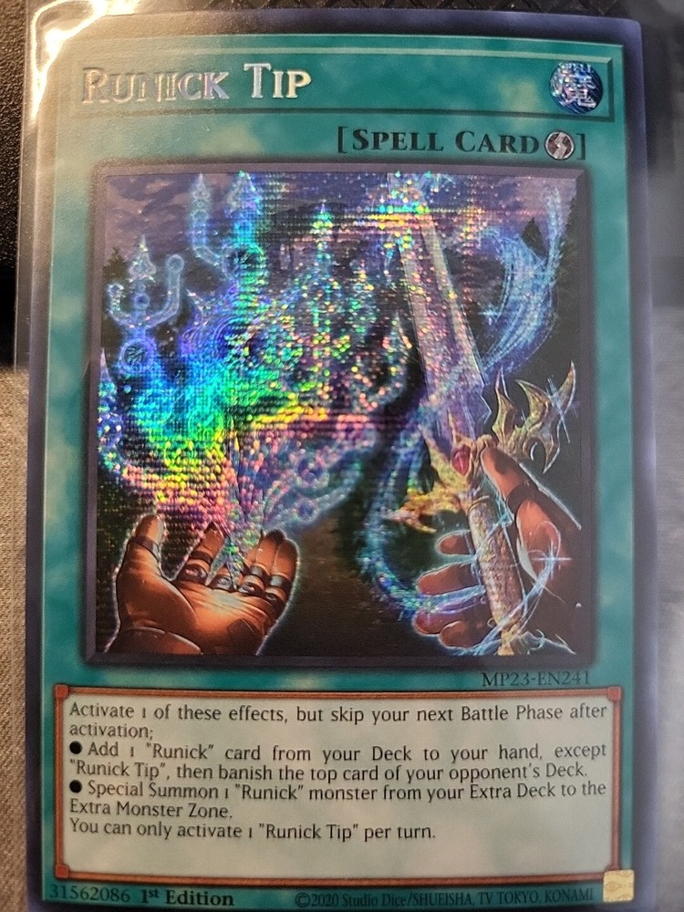 For sale is a Yu-Gi-Oh! TCG card named Runick Tip. This card belongs to the Hero type of Creature/Monster and is a 1st Edition Spell-Quick Play card with the card number Mp23-En241. It is a part of the 25th Anniversary Tin: Dueling Heroes Mega Pack set and has a Rarity of Prismatic Secret Rare. The card is in Near mint or better condition and is ungraded.