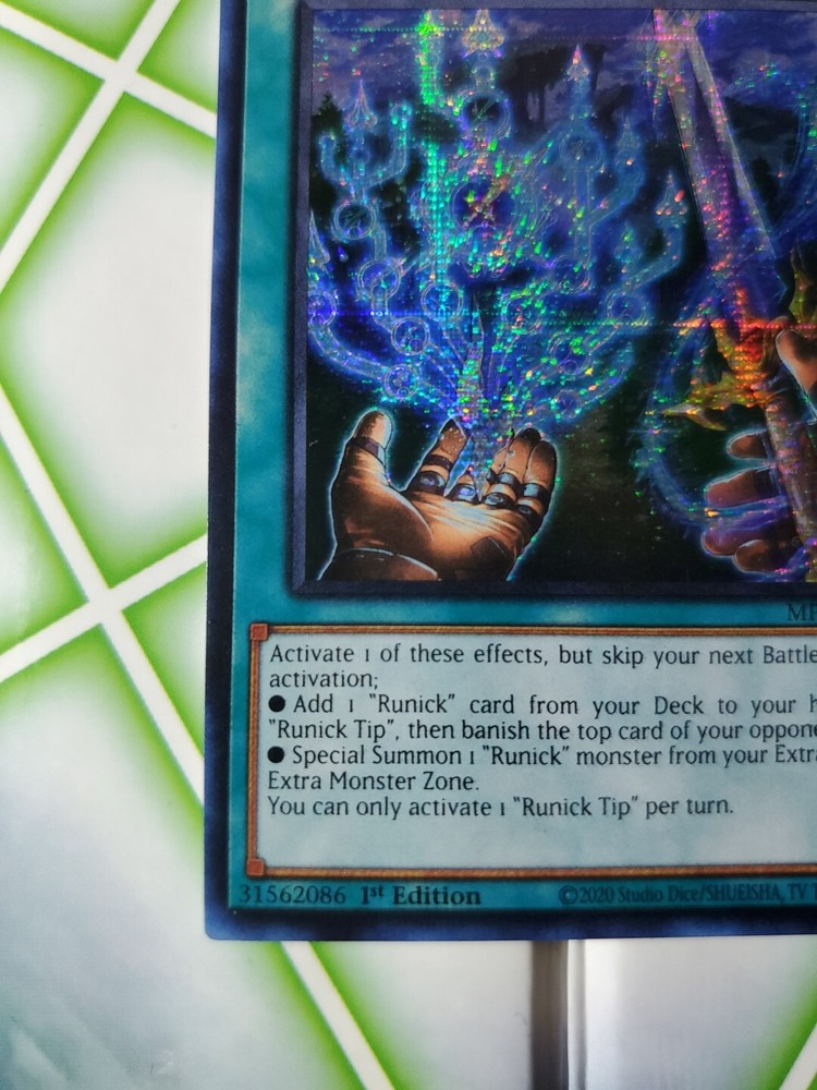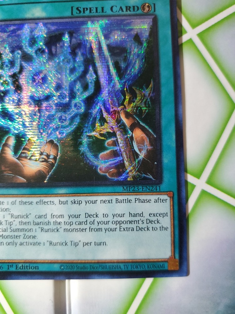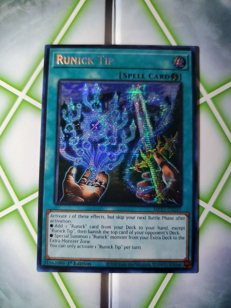 Introducing the Yu-Gi-Oh! TCG Runick Tip 25th Anniversary Tin: Dueling Heroes Mega Pack. This rare, prismatic secret rare card features 1st edition, and card number Mp23-En241. The card is in near mint or better condition and has not been graded. Manufactured by Konami, the Runick Tip card is a must-have addition to any serious collector's deck. Its English language and game set, along with its unique attributes and features, make it a highly sought-after item among Yu-Gi-Oh! enthusiasts. Get your hands on this rare gem today!