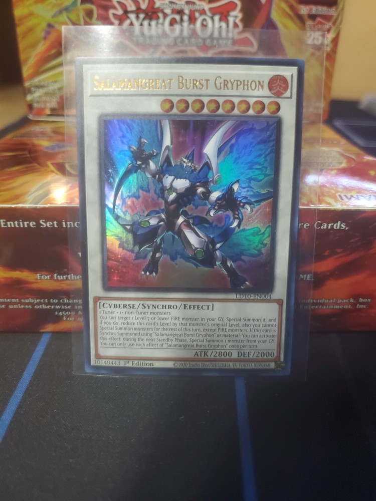 This Yu-Gi-Oh! TCG card, Salamangreat Burst Gryphon, is a powerful 1st Edition Effect Synchro Monster. It boasts an Attack/Power of 2800 and a Defense/Toughness of 2000. Its Creature/Monster Type is Cyberse and it belongs to the Legendary Duelists: Soulburning Volcano Set, with card number Ld10-En004.This card is perfect for CCG Individual Cards collectors and those who enjoy playing Collectible Card Games. Its Features make it a rare find and a valuable addition to any collection. Get your hands on Salamangreat Burst Gryphon now!