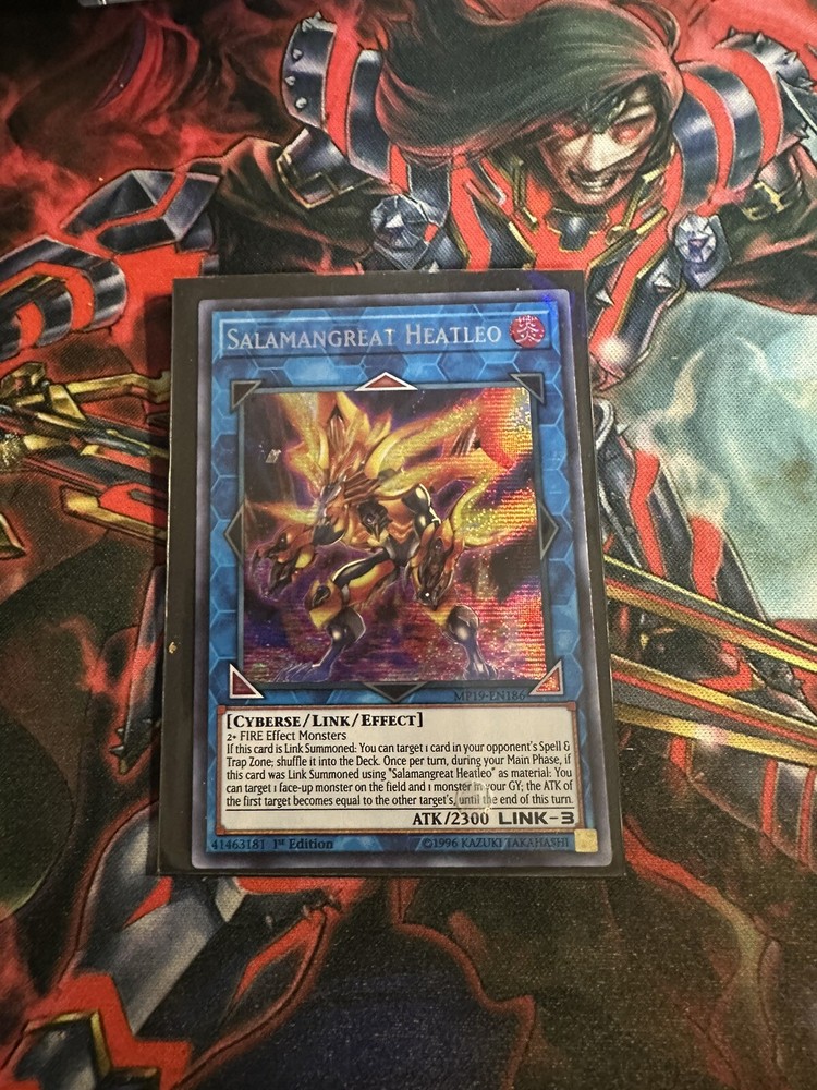 This Yu-Gi-Oh! TCG card is a 1st Edition Salamangreat Heatleo with a Fire attribute and Cyberse creature/monster type. It has a Link-3 defense/toughness and an Attack/Power of 2300. The card is part of the 2019 Gold Sarcophagus Tin Mega Pack set and has a Prismatic Secret Rare rarity. The card number is MP19-EN186 and it was manufactured in 2019. This Effectlink Monster card is perfect for any Yu-Gi-Oh! TCG collector or player looking to add a rare and powerful card to their deck.