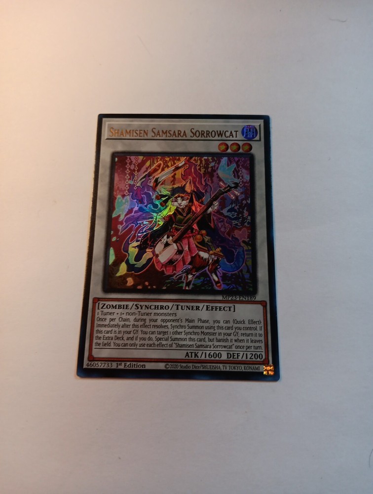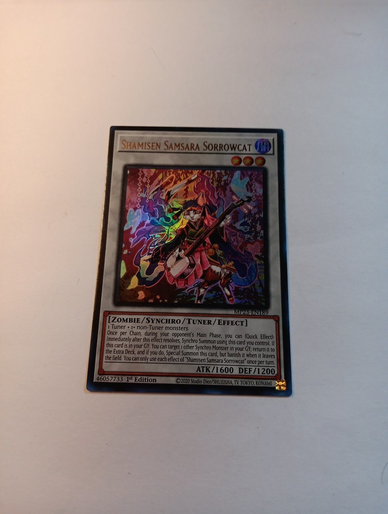 This Yu-Gi-Oh! TCG card is a 1st edition Shamisen Samsara Sorrowcat from the 25th Anniversary Tin: Dueling Heroes Mega Pack. It is a Dark-colored, Ultra Rare card with an Attack/Power of 1600 and Defense/Toughness of 1200. The card type is an Effect Tuner Synchro and it features a Zombie Creature/Monster Type. The card number is MP23-EN189 and it is a perfect addition to any collector's set.