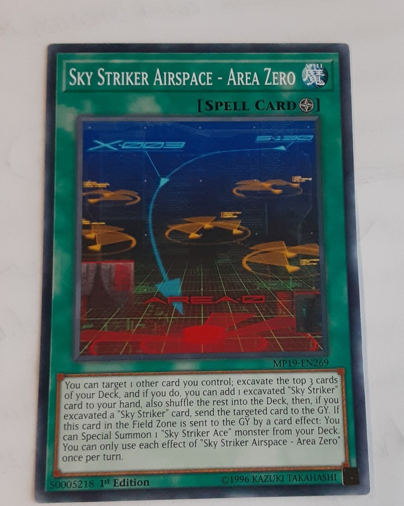Get your hands on the sought-after Yu-Gi-Oh! TCG card, Sky Striker Airspace - Area Zero from the 2019 Gold Sarcophagus Tin Mega Pack. This rare card is a Spell-Field type with a Card Number of MP19-EN269. It features 1st Edition and is in Near Mint or better Condition Type. This card is perfect for avid collectors and players of the Yu-Gi-Oh! TCG game. Its Rarity is Common and it belongs to the Attribute/MTG:Color category of Spell. The card was manufactured in 2019 and is a great addition to your collection. Don't miss out on this opportunity to own a piece of the Yu-Gi-Oh! universe.