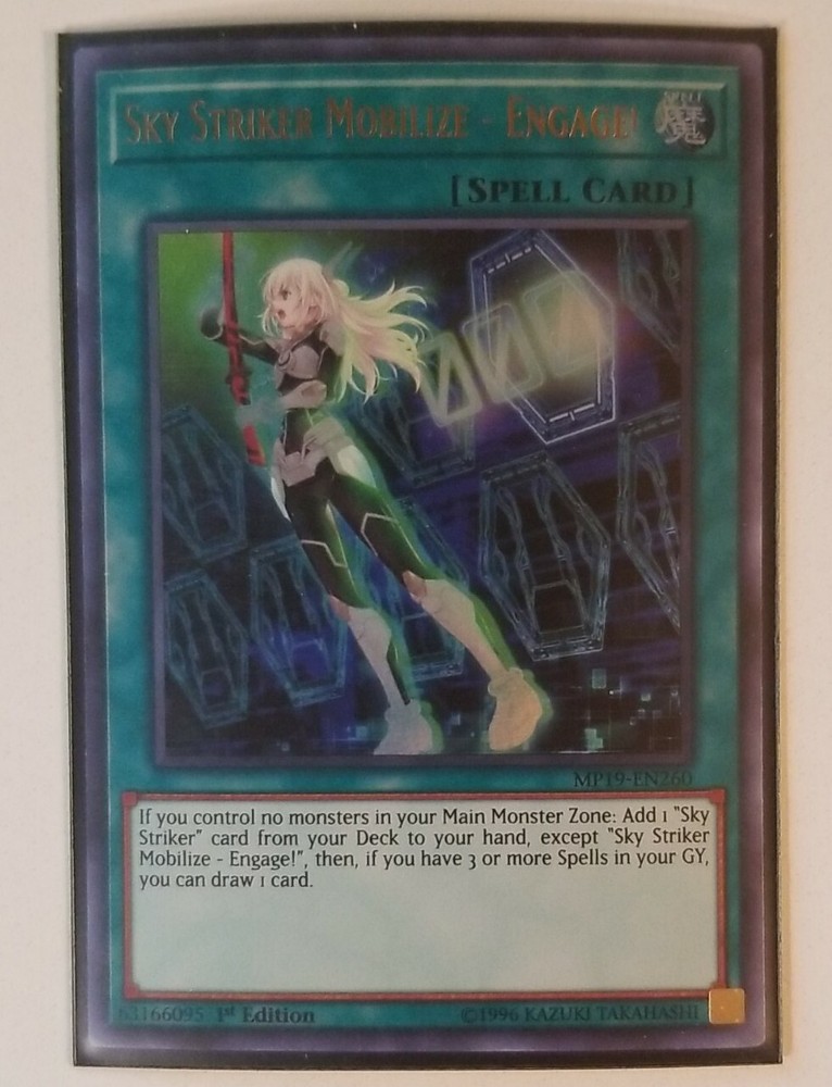 Description: All Cards under $ 20 will be shipped using the Ebay Standard envelope. Please be advised that this type shipment includes fewer tracking updates. If it does not arrive you will need to contact Ebay for further action, as there are no refunds. If you live outside the continental USA, please select First Class Mail. Otherwise it will be shipped per your requested shipping method. Only cards valued over $25.00 are sent in a Top Loader. If you request a top loader there will be an additional fee. Please, read carefully the following! Feedback: Please, leave positive feedback and we will do the same for you. If you are not satisfied enough to leave us a 5 star rating , we will work with you to avoid negative or neutral feedback. E-mail us with problems or concerns BEFORE you leave any feedback. COMMUNICATION is the key. Grading : Mint: The card has no visible marks. Almost every card has a flaw even if it is new, so this rating is rarely used. Near Mint: The card has minor flaws that are not apparent at first sight. It may have very little white pocks or scratches that you have to really look for in order to see them. Near Mint/Lightly Played: Overall good appearance. Little scratches, picks, worn edges, slight bends or creases can be seen but does not impede the card's integrity. Lightly Played: Similar to a lightly played/near mint condition card except there is more whitening around the edges and the corners are a little more worn. There might be some small amount of whitening on the back face or front face. Even a casual inspection will show the defects. When the card is in a sleeve the defects will not be as noticeable and the card will likely blend in with other cards. Played: There is excessive whitening around the edges and the corners have a good amount of wear, a lot of scratches, picks, bends and creases. When you put the card in a sleeve, it might stick out due to its condition, but nonetheless, still playable in a sleeve. Yu-Gi-Oh! TCG Sky Striker Mobilize - Engage! 2019 Gold Sarcophagus Tin Mega Pac….