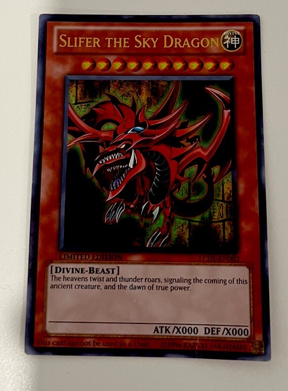 This limited edition Yu-Gi-Oh! TCG card features the powerful Slifer The Sky Dragon, with an attack of X000 and defense of X000. The card is part of the Legendary Collection: 25th Anniversary Edition set, and is an ultra rare card with a card number of LC01-EN002. The card is of the Divine-Beast creature/monster type, with a card type of normal and game of Yu-Gi-Oh! TCG. The card name is "Slifer The Sky Dragon" and it belongs to the Attribute/MTG category of Divine color. This card is perfect for collectors and players alike, and is sure to be a valuable addition to any collection.