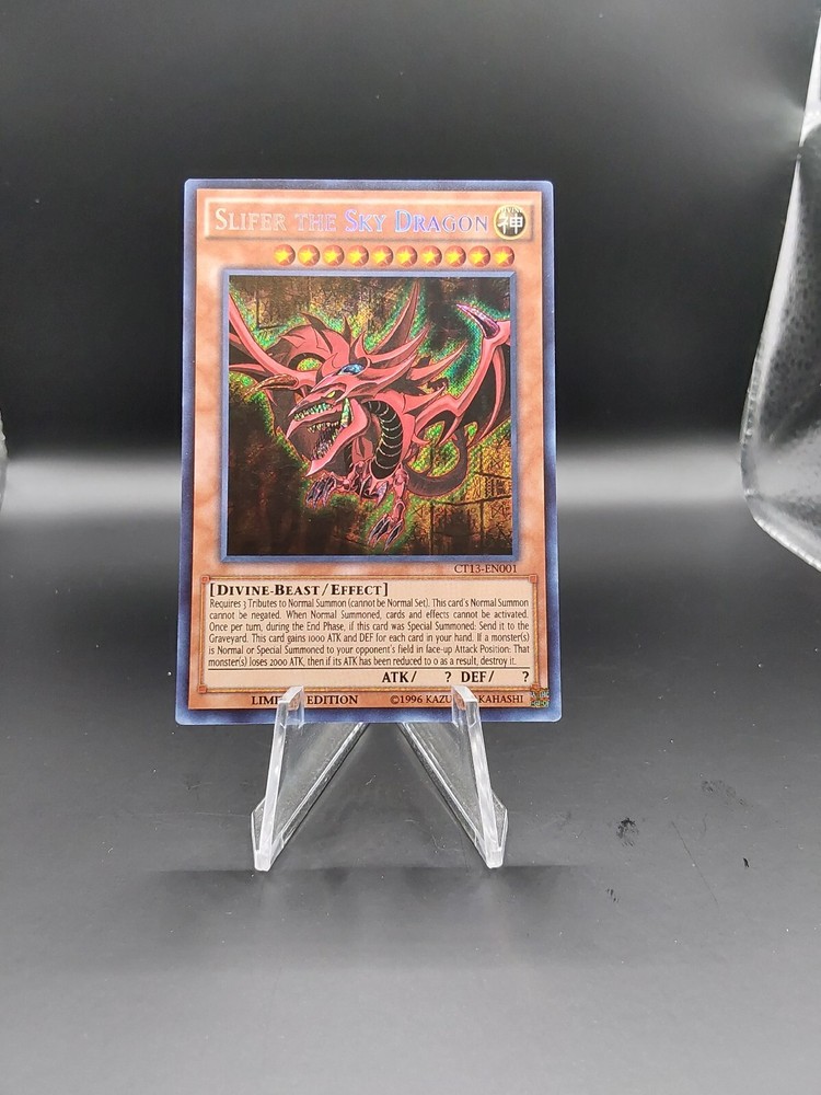 This limited edition Yu-Gi-Oh! TCG card features the powerful Slifer the Sky Dragon, a Divine-Beast monster with unknown attack and defense points. The card is from the 2016 Mega-Tins set and has a Secret Rare rarity, making it a highly sought-after collectible item for fans of the game. The card is made of high-quality card stock and has a foil finish, adding to its aesthetic appeal. The card bears the manufacturer's mark of Konami and is in English language. It is not graded and is not autographed. This card is a must-have for any fan of the game who wants to add a rare and valuable piece to their collection.