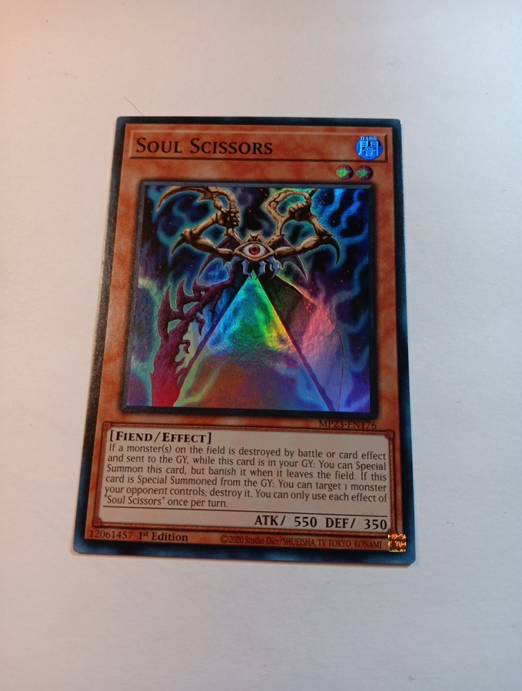 This Yu-Gi-Oh! TCG card is a must-have for any collector or player. With a super rare rarity and first edition feature, the Soul Scissors card is a powerful addition to any deck. The card belongs to the Fiend creature/monster type and has an attack power of 550 and defense/toughness of 350. The card is part of the 25th Anniversary Tin: Dueling Heroes Mega Pack set and has the card number MP23-EN176. It is an effect card with a dark color attribute and belongs to the collectible card games category under toys and hobbies. Get your hands on this valuable card and enhance your Yu-Gi-Oh! TCG collection.