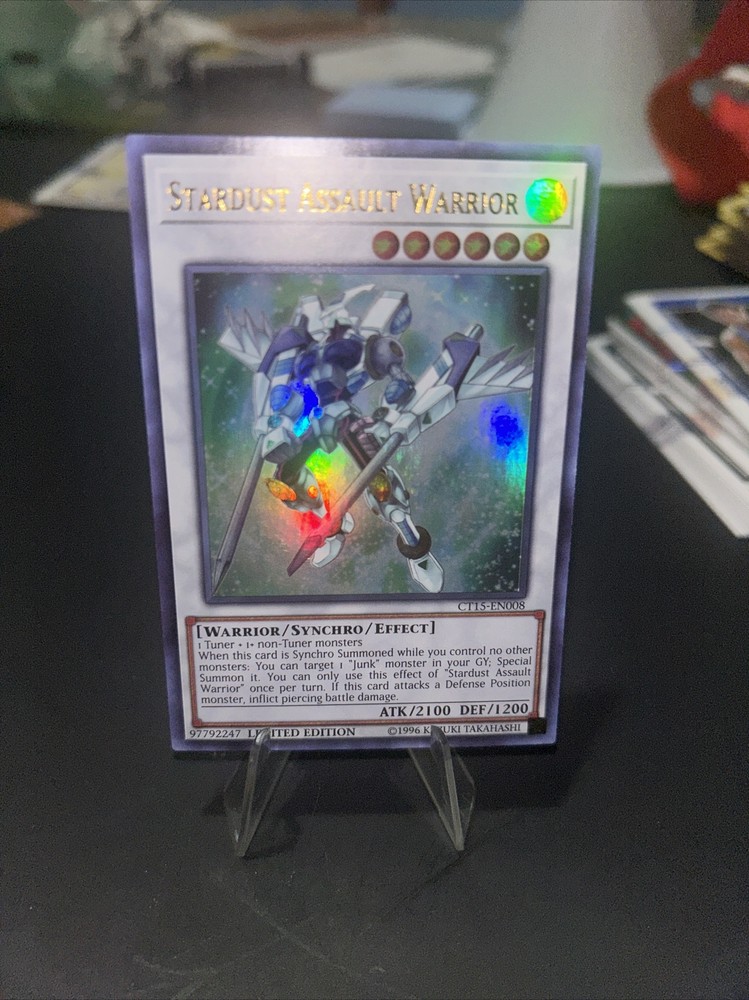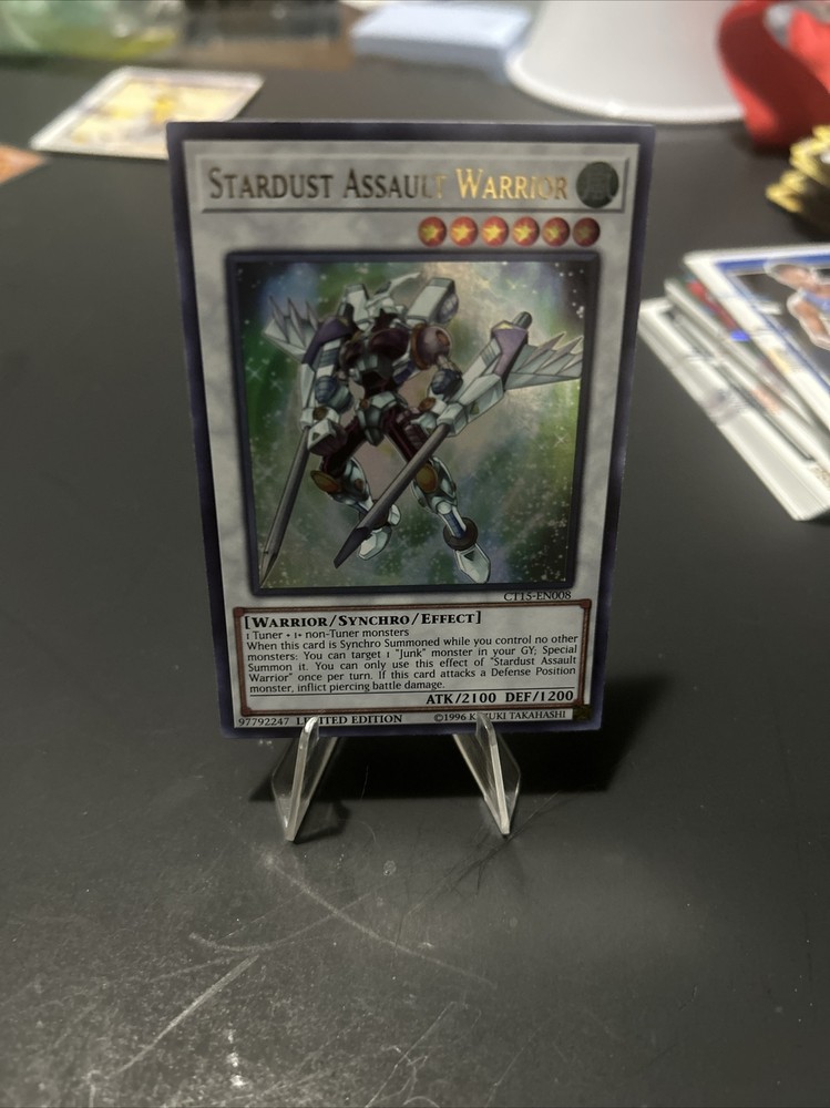 This Yu-Gi-Oh! TCG card is a must-have for any collector or player. The Stardust Assault Warrior card features a powerful 2100 attack and 1200 defense, making it a formidable addition to any deck. Its limited edition status and ultra rare rarity make it a highly sought-after card. The card is an effect synchro monster type, with the card number CT15-EN008. It belongs to the 2018 Mega-Tins Promos set and is classified under the Toys & Hobbies and Collectible Card Games categories. Its wind attribute and warrior creature/monster type make it a valuable addition to any Yu-Gi-Oh! TCG deck.