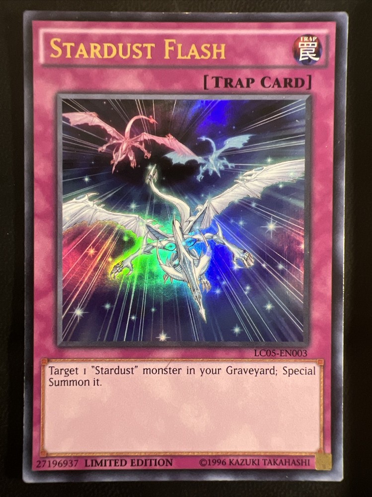 This Yu-Gi-Oh! TCG card is a must-have for collectors! It features the ultra-rare Stardust Flash card from the Legendary Collection 5D's set, with a limited edition print run. The card is in near mint or better condition and is a Trap-Normal type with card number LC05-EN003. This card is perfect for fans of the Yu-Gi-Oh! TCG looking to expand their collection with a rare and valuable addition. Buy multiple cards or item and save with combined shipping. MUST MESSAGE SELLER BEFORE CHECKOUT to receive combined shipping discount!! All cards shipped securely with sleeve and top loader. Please checkout my eBay store CardShark. New cards being added daily. Shipping usually within 1-2 days of payment. Please contact me immediately if there is ever an issue with a purchase. It will be remedied ASAP. If you are happy with a purchase please feel free to FOLLOW my store CardShark and leave some positive feedback. Thanks for shopping at CardShark and have an amazing day.