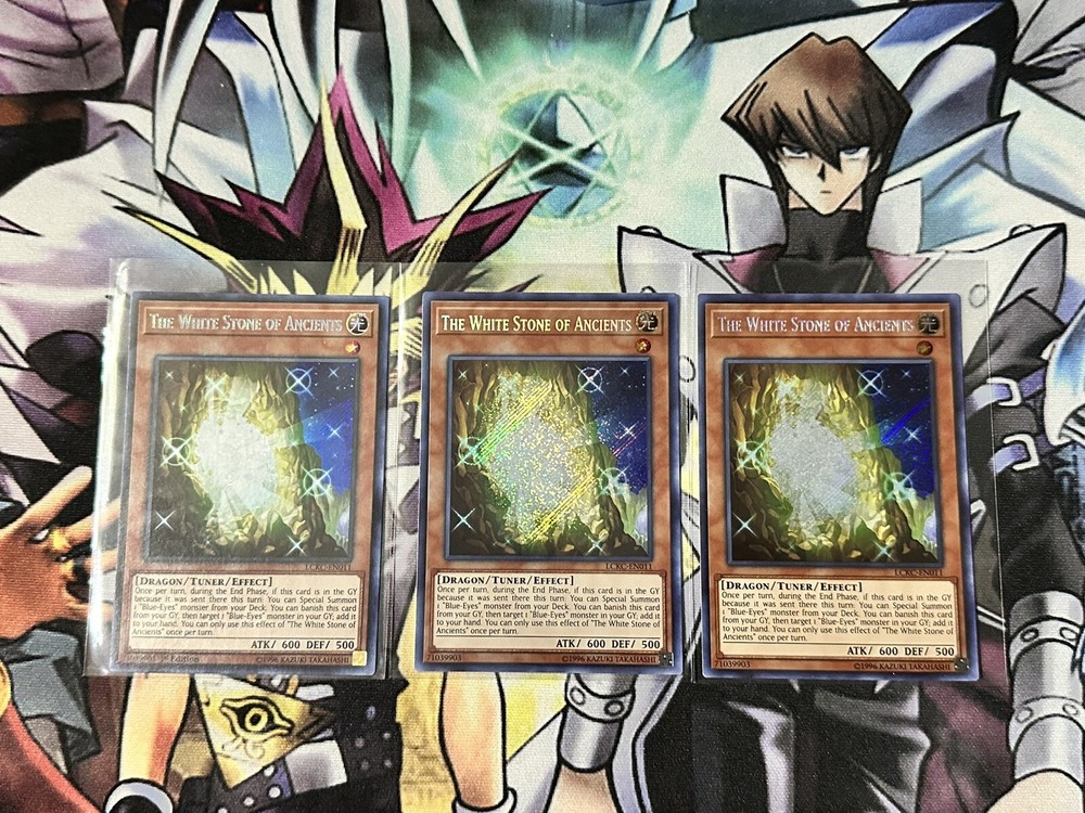 Buyer will receive a playset (3 copies) of The White Stone of Ancients Secret Rare (1 1st edition and 2 unlimited) from Legendary Collection Kaiba set. Cards are pack fresh, straight from pack to sleeve and in NM/M condition as shown in the pictures. If you have any further questions about this item, please feel free to send me a message! Thank you for checking out my listing(s)!