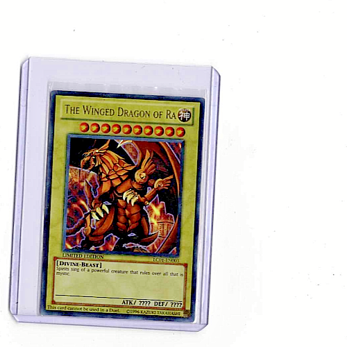 For all you Yu-Gi-Oh! fans out there, this is an opportunity to get your hands on a rare limited edition card. This card features the all-powerful 'The Winged Dragon of Ra' character from the Legendary Collection set. It is made of high-quality card stock material with a beautiful holo finish. The card is in excellent shape and is perfect for collectors and players alike. Don't miss out on the chance to own this ultra-rare card, with the card number LC01-EN003. Add it to your Yu-Gi-Oh! TCG collection today!