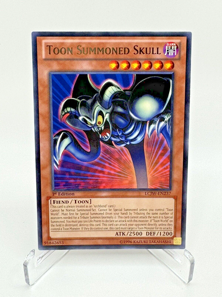 This Yu-Gi-Oh! TCG card is a must-have for any collector or player. With a powerful attack of 2500 and a rare rarity, the Toon Summoned Skull card is sure to impress. It belongs to the Legendary Collection 4 Mega-Pack set and has a card number of LCJW-EN237. The card features a Fiend creature type and an Effect card type, with a Defense/Toughness of 1200. This 1st edition card is in great shape, ready to be added to your collection or used in your next game. Don't miss out on the opportunity to own this amazing card!